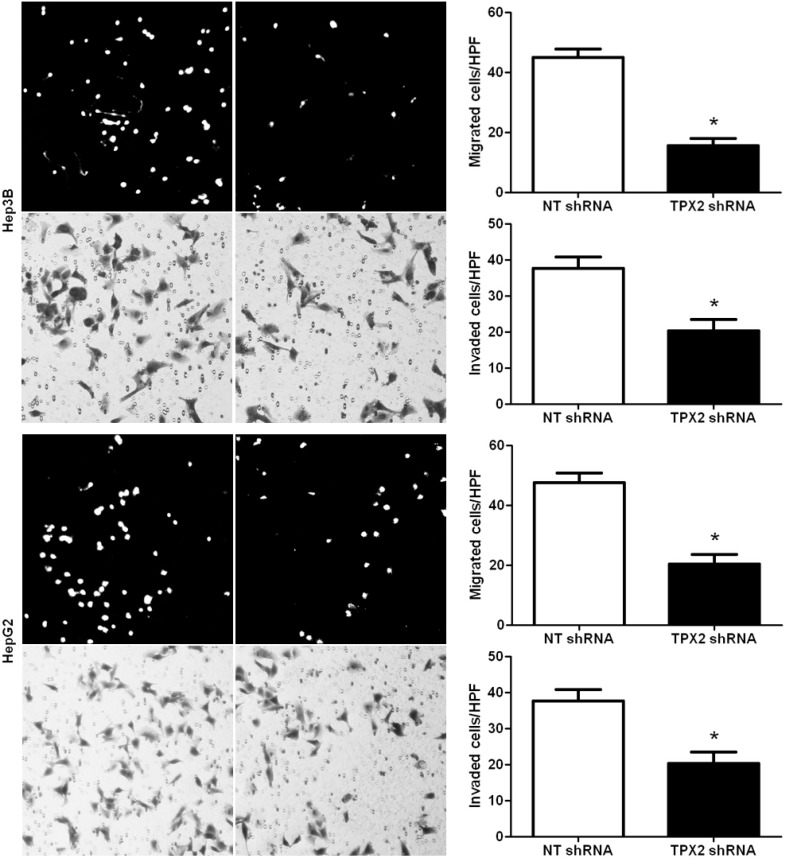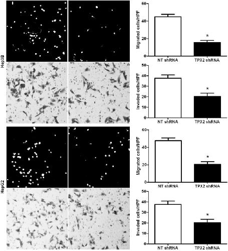Figure 5. TPX2 knockdown inhibits HCC cell migration and invasion. Cell migration as measured by Boyden chamber assays was inhibited by TPX2 knockdown in Hep3B and HepG2 cells as compared with control cells. TPX2 down-regulating Hep3B and HepG2 cells conferred a less number of invaded cells as compared with control cells. n = 6 repeats with similar results; *