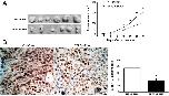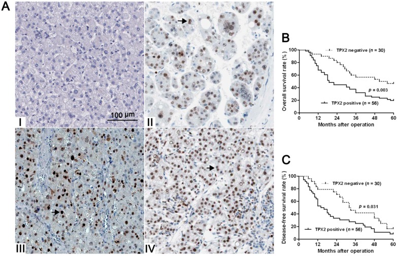 Figure 2. The immunostaining of TPX2 and its prognostic significance in HCC specimens. (A) Immunohistochemical staining of TPX2 in HCC. TPX2 was localized within the nuclei. Elevated expression of TPX2 (the arrows) in the tumor cells of HCC tissue (II, III, and IV) compared to normal tumor-adjacent tissues with negative staining (I) (scale bar: 100 μm); (B) The overall survival (OS) and (C) disease-free survival rates (DFS) were estimated by the Kaplan-Meier method. Both the OS rate and DFS rate of patients with TPX2 positive primary tumor were significantly lower than that of patients with TPX2 negative primary tumor (log-rank test, p < 0.05).