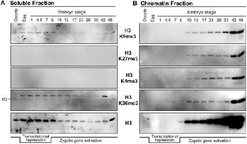Figure 5. Soluble and chromatin-bound histone isolation analysis of H3 PTMs during early development. (A) As in Figure 3, equivalent volume of total soluble protein from the staged embryo fractionation was immunoblotted for H3, H4, and H3 K9me3, K27me3, K4me3, and K36me3. Total soluble protein is shown in the Coomassie stained gel at the bottom. The period of transcriptional repression post fertilization is indicated at the bottom. (B) Equivalent volume of total chromatin protein from the staged embryo fractionation was immunoblotted for H3, H4, and H3 K9me3, K27me3, K4me3, and K36me3. Total chromatin protein is shown in the Coomassie stained gel at the bottom. The stained histone protein bands are annotated.
