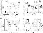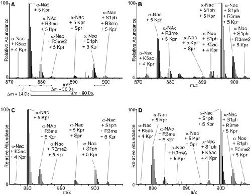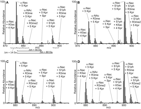 Figure 6. Example high resolution MS1 scans of H2A.X-F 1–31. Shown are high resolution MS1 scans of various PTM states seen on the [M + 4H]+4 ions of the 1–31 residue, chymotrypsin-generated peptides of H2A.X-F1 and -F2 from egg and pronuclei. All ions exhibiting a charge state of +4 are labeled. As an example, in panel A, differences of 14 Da, 56 Da, and 80 Da are noted to represent the addition of methylations/acetylations, priopionylations (Kpr and Spr), and phosphorylations, respectively. Note that H2As are 100% α-N-terminally acetylated and in the absence of acetylation, lysines are propionylated. Since the Δm for an acetylation is 42 Da while the Δm for a priopionylation is 56 Da, the K5ac form of the peptide appears at a lower mass than the α-N-acetylated (‘unmodified’) form of the peptide. Also note that serine residues can be propionylated at low levels. (A) H2A.X-F1 from egg. (B) H2A.X-F1 from pronuclei. (C) H2A.X-F2 from egg. (D) H2A.X-F2 from pronuclei.