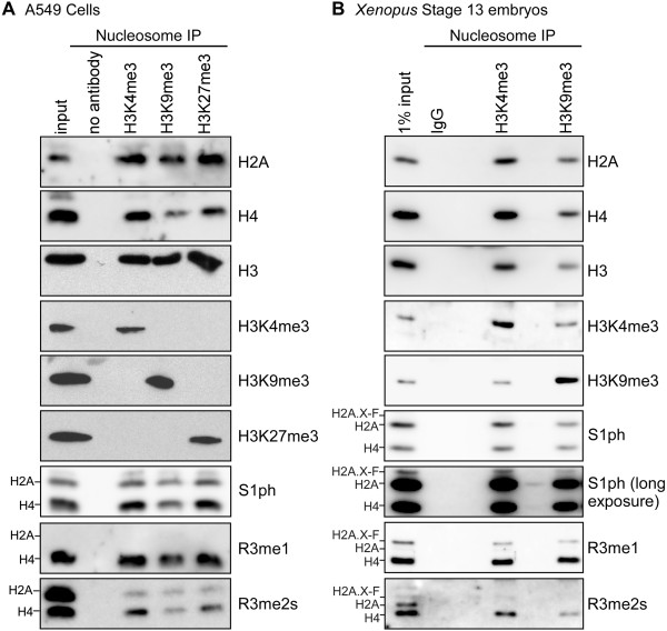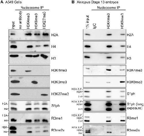 Figure 7. Nucleosome immunoprecipitation demonstration of S1ph and R3me1/2 s coenrichment with active and repressive histone PTMs. (A) Chromatin from A549 cells was digested with micrococcal nuclease and immunoprecipitated with anti-H3K4me3, H3K9me3, and H3K27me3 antibodies. Precipitated histones were blotted for H2A, H3, H4, H3K4me3, K9me3, K27me3, S1ph, R3me1, and R3me2s as indicated. (B) Chromatin from stage 13 Xenopus embryos was digested with micrococcal nuclease and immunoprecipitated with control IgG, anti-H3K4me3, and H3K9me3 antibodies. Precipitated histones were blotted for H2A, H3, H4, H3K4me3, K9me3, S1ph, R3me1, and R3me2s as indicated.