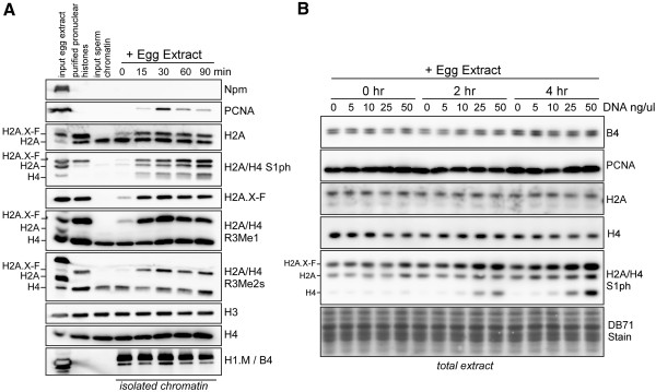 Figure 1. H2A and H2A.X-F S1 phosphorylation and R3 methylation are enriched on pronuclei, while H4 S1 phosphorylation is DNA concentration dependent. (A) Pronuclei were assembled in egg extract and chromatin was isolated through a sucrose cushion at 0, 15, 30, 60, and 90 min post incubation. Isolated chromatin proteins were immunoblotted as shown (right five lanes). Input egg extract, purified pronuclear histones, and sperm histones were also immunoblotted (left three lanes). (B) Egg extract was incubated with increasing concentrations of plasmid DNA (0, 5, 10, 25, and 50 ng/μL) for 0, 2, or 4 h. Samples of the total reaction were immunoblotted as shown.