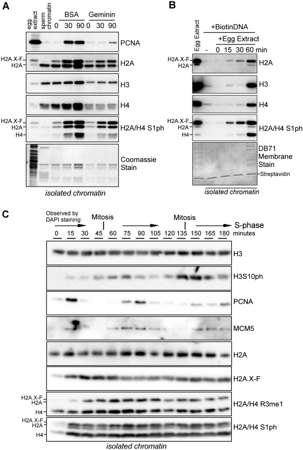 Figure 2. H2A and H2A.X-F S1 phosphorylation is independent of DNA replication and the cell cycle. (A) Sperm chromatin was incubated in egg extract with the addition of BSA (control) or the addition of 150 ng of Geminin to inhibit DNA replication. The reactions were flash-frozen at 0, 30, or 90 min and chromatin was isolated through a sucrose cushion and immunoblotted as shown. The migration positions of H2A.X-F, H2A, and H4 are indicated. (B) Double-stranded DNA bound to streptavidin beads was incubated in egg extract for 0, 15, 30, or 60 min, then isolated and washed. Precipitated protein was immunoblotted for H2A, H3, H4, and S1ph as indicated. (C) Sperm chromatin was incubated in cycling egg extract and aliquots were flash-frozen every 15 min, from 0 to 180 min. Chromatin was isolated through a sucrose cushion and immunoblotted as shown. Interphase and mitosis were observed by DAPI-stained chromatin and noted at the top of the panel.