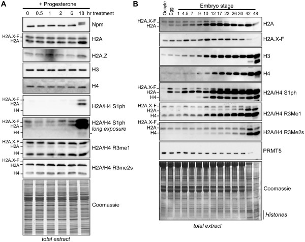 Figure 3. H2A and H2A.X-F are dynamically modified during oocyte maturation and early development. (A) Stage VI oocytes were treated with 15 μM progesterone and samples from 0, 0.5, 1, 2, 6, and 18 h post-treatment were collected, frozen, and lysed for immunoblot analysis as shown. Total protein is shown in the Coomassie stained gel at the bottom. The migration positions of H2A.X-F, H2A, and H4 are indicated. (B) Pooled oocytes, eggs, and fertilized embryos through stage 48 were collected, frozen, and lysed. Total protein samples were immunoblotted as shown. Total protein is shown in the Coomassie stained gel at the bottom. The migration positions of H2A.X-F, H2A, and H4 are indicated.
