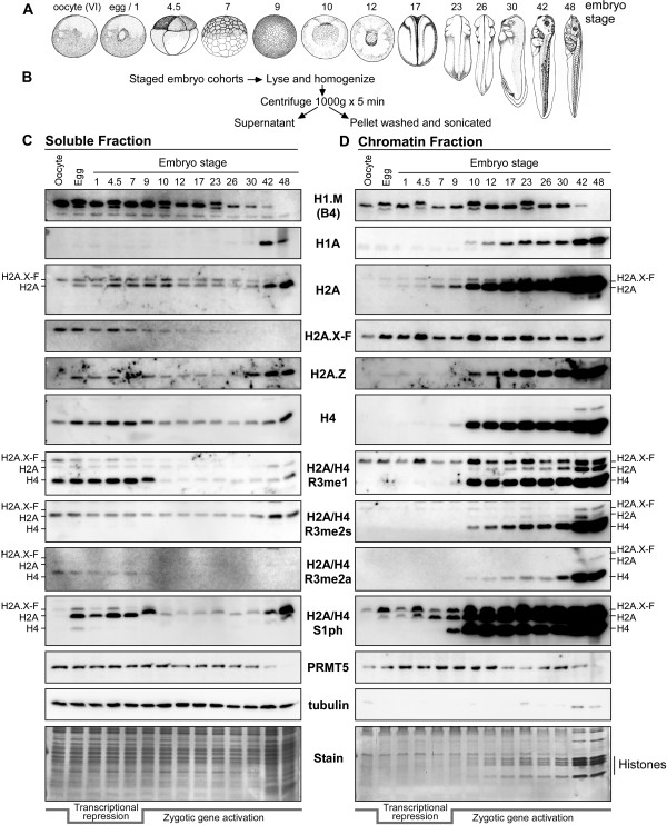 Figure 4. Soluble and chromatin-bound histone isolation reveals distinct patterns of H2A and H2A.X-F modification during early development. (A) Cartoons of the embryo stages that we collected (drawings Copyright 1994 from Normal Table of Xenopus Laevis (Daudin) by Faber et al. Reproduced by permission of Garland Science/Taylor & Francis LLC). (B) Embryo fractionation scheme: five embryos per stage were collected, lysed, and homogenized, centrifuged at 1,000 g and the supernatant containing soluble histones was removed. The pellet was washed in the lysis buffer and then sonicated. This material was used as the chromatin fraction. (C) Equivalent volume of total soluble protein from the staged embryo fractionation was immunoblotted for linker histones, core histones, and the conserved H2A/H2A.X-F/H4 modifications as shown. Total soluble protein is shown in the Coomassie stained gel at the bottom. The period of transcriptional repression post fertilization is indicated at the bottom. The migration positions of H2A.X-F, H2A, and H4 are indicated on the left. (D) Equivalent volume of total chromatin protein from the staged embryo fractionation was immunoblotted for linker histones, core histones, and the conserved H2A/H2A.X-F/H4 modifications as shown. Total chromatin protein is shown in the Coomassie stained gel at the bottom. The stained histone protein bands are annotated. The period of transcriptional repression post fertilization is indicated at the bottom. The migration positions of H2A.X-F, H2A, and H4 are indicated on the right.