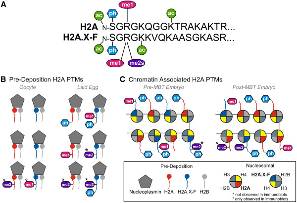 Figure 8. Model of the location and timing of H2A PTMs pre and post deposition during embryogenesis. (A) N-terminal amino acid sequence of Xenopus laevis canonical H2A and H2A.X-F. The modifications we observed by antibody or by mass spectrometry are illustrated: α-N-acetylated and lysine acetylation (green), Ser 1 phosphorylation (blue), Arg 3 mono-methylation (red) and dimethylation (purple). (B) Summary of R3 methylation (me1 and me2) and phosphorylation (ph) found on pre-deposition H2A (red) and H2A.X-F (blue) in the oocyte and laid egg soluble fractions, where they are bound to the chaperone Nucleoplasmin. * = PTMs not observed in immunoblots, ° = only observed in immunoblots. Oocyte histone PTMs were not assayed by mass spectrometry so the cartoon in the left-most column only represents immunoblot data. Co-occupancy of PTMs on a single histone tail was solely identified by mass spectrometry. (C) Summary of R3 methylation and phosphorylation found on chromatin associated H2A and H2A.X-F in embryos. PTMs found on pre-mid blastula transition (MBT) embryos are shown on the left, while post-MBT embryos are shown on the right. * = PTMs not observed in immunoblots, ° = PTMs only observed in immunoblots. The boxed legend references panels B and C. Co-occupancy of PTMs on a single histone tail was solely identified by mass spectrometry.
