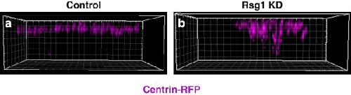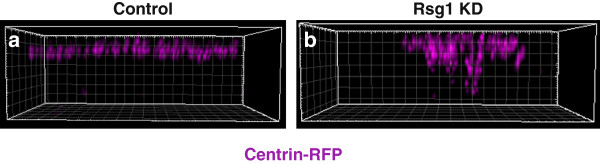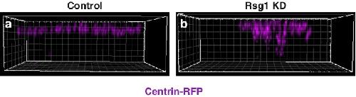 Figure 5. Rsg1 controls apical trafficking of basal bodies. (a) A 3D-reconstruction of the long axis of a control MCC shows a consistent localization of centrin-RFP foci to the apical surface. (b) A 3D-reconstruction of the long axis of an Rsg1 KD MCC shows a disorganization of centrin-RFP foci and failure of some foci to localize apically. The grid-boxes in a and b are in 1 ?m increments.