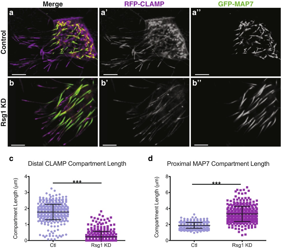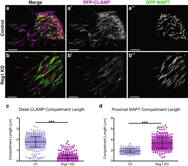 0.23 ± 0.34 μm, n = 361 axonemes, 28 cells, 5 embryos; ***P <0.0001). (d) Quantification of GFP-MAP7-positive compartments reveals a significant increase in proximal identity (Ctl: 1.90 ± 0.36 μm, n = 452 axonemes, 29 cells, 5 embryos vs. Rsg1 KD: 3.32 ± 0.95 μm, n = 364 axonemes, 39 cells, 5 embryos; ***P <0.0001). Scale bars represent 5 μm.