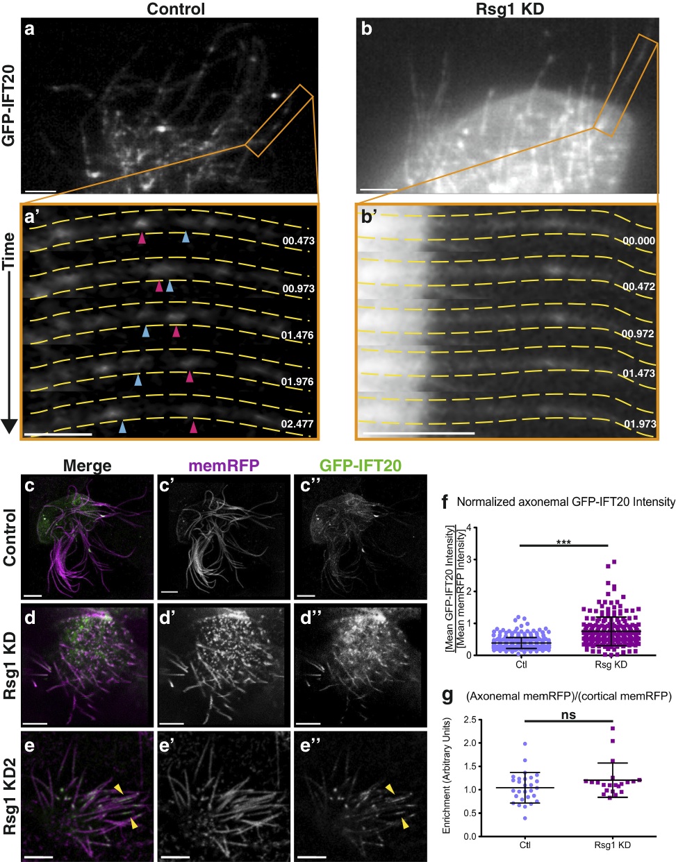Figure 2. GFP-IFT20 accumulates in axonemes of Rsg1 KD MCCs. (a) High-magnification confocal image of axonemes from a control MCC expressing GFP-IFT20. The orange box indicates the region shown in a?. See also Additional file 1: Movie 1. (a?) A series of stills from Additional file 1: Movie 1. Yellow dashed lines outline the axoneme and distal is to the right. Pink and blue arrowheads indicate an anterograde train and a retrograde train, respectively. (b) High-magnification confocal image of axonemes from an Rsg1 KD MCC expressing GFP-IFT20. Orange box represents the region shown in b?. See also Additional file 2: Movie 2. (b?) A series of stills from Additional file 2: Movie 2. Yellow dashed lines outline the axoneme and distal is to the right. No IFT trains are visible during the course of the movie. (c?c?) A single confocal slice of an control MCC co-expressing membraneRFP and GFP-IFT20. (d?d?). A single confocal slice of an Rsg1 KD MCC co-expressing membraneRFP and GFP-IFT20. (e?e?) A single confocal slice of an Rsg1 KD2 (second-site morpholino) MCC co-expressing membrane-RFP and GFP-IFT20. Yellow arrowheads indicate large GFP-IFT20 accumulations in distal axonemes. (f) Quantification of mean GFP-IFT20 signal along control and Rsg1 KD axonemes, as normalized to membrane-RFP intensity along the same length. Note the increase in normalized IFT20 signal in Rsg1 KD axonemes (Ctl: 0.39 ? 0.17, n = 304 axonemes, 36 cells, 7 embryos vs. Rsg1 KD: 0.75 ? 0.45, n = 223 axonemes, 31 cells, 6 embryos; ***P <0.0001). (g) There is no significant difference in axonemal average membrane-RFP signal as normalized to cortical membrane-RFP signal from the same cell, between control and Rsg1 KD conditions (Ctl: 1.04 ? 0.33, n = 28 cells, 6 embryos vs. Rsg1 KD: 1.21 ? 0.36, n = 21 cells, 6 embryos; P = 0.2607). Scale bars in a?b? indicate 3 ?m. Scale bars in c-e? indicate 5 ?m. Time stamps in a? and b? are relative to the first frame of Additional file 1: Movie 1 and Additional file 2: Movie 2, respectively.