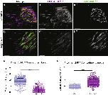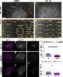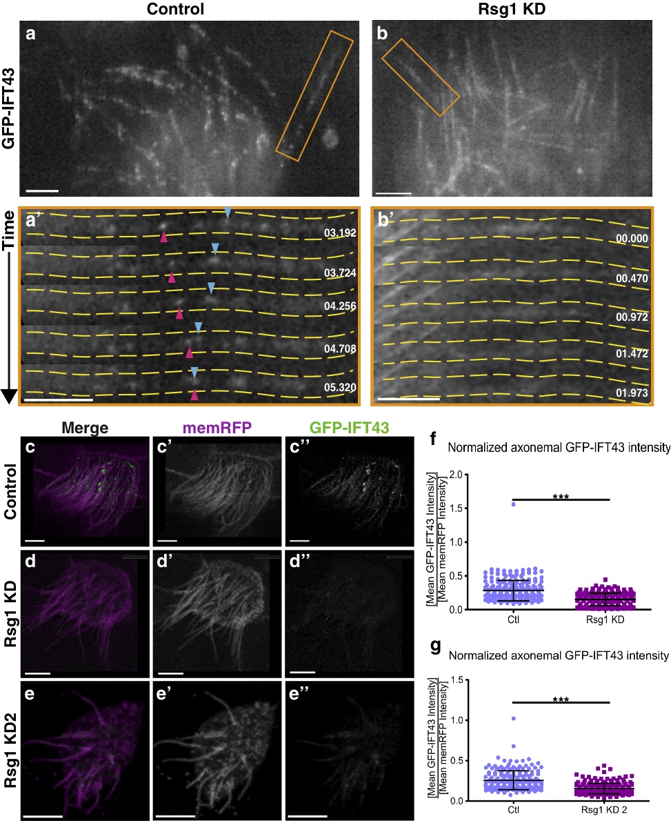 Figure 3. GFP-IFT43 axonemal localization is reduced in Rsg1 KD MCCs. (a) High-magnification confocal image of axonemes from a control MCC expressing GFP-IFT43. The orange box indicates the region shown in a?. See also Additional file 3: Movie 3. (a?) A series of stills from Additional file 3: Movie 3. Yellow dashed lines outline the axoneme, and distal is to the right. Pink and blue arrowheads indicate an anterograde train and a retrograde train, respectively. (b) High-magnification confocal image of axonemes from a Rsg1 KD MCC expressing GFP-IFT43. Orange box represents the region shown in b?. See also Additional file 4: Movie 4. (b?) A series of stills from Additional file 4: Movie 4. Yellow dashed lines outline the axoneme, and distal is to the right. No IFT trains are visible during the course of the movie. Note that the entire axoneme exhibits a faint uniform background signal. (c?c?) A single confocal slice of a control MCC co-expressing membrane-RFP and GFP-IFT43. (d?d?) A single confocal slice of an Rsg1 KD MCC co-expressing membrane-RFP and GFP-IFT43. (e?e?) A signal confocal slice of an Rsg1 KD2 MCC co-expressing membrane-RFP and GFP-IFT43. (f) Quantification of mean GFP-IFT43 signal along control and Rsg1 KD axonemes, as normalized to membrane-RFP intensity along the same length. Note the decrease in normalized IFT43 signal in Rsg1 KD axonemes (Ctl: 0.28 ? 0.15, n = 225 axonemes, 28 cells, 5 embryos vs. Rsg1 KD: 0.15 ? 0.09, n = 250 axonemes, 32 cells, 6 embryos; ***P <0.0001). (g) Quantification of mean GFP-IFT43 signal along control and Rsg1 KD2 axonemes, as normalized to membrane-RFP intensity along the same length (Ctl: 0.26 ? 0.12, n = 200 axonemes, 44 cells, 6 embryos vs. Rsg1 KD: 0.15 ? 0.06, n = 223 axonemes, 52 cells, 6 embryos; ***P <0.0001). Scale bars in a?b? indicate 3 ?m. Scale bars in c?e? indicate 5 ?m. Time stamps in a? and b? are relative to the first frame of Additional file 3: Movie 3 and Additional file 4: Movie 4, respectively.