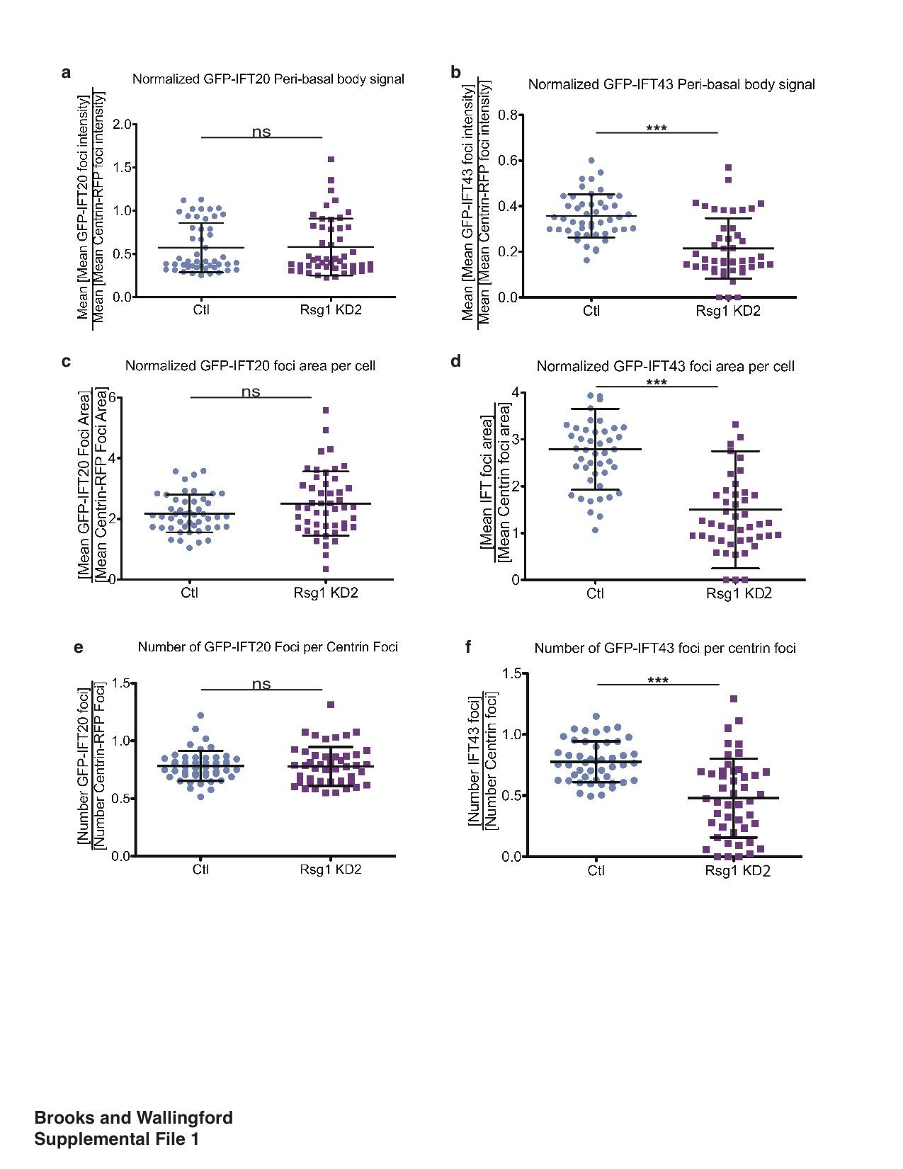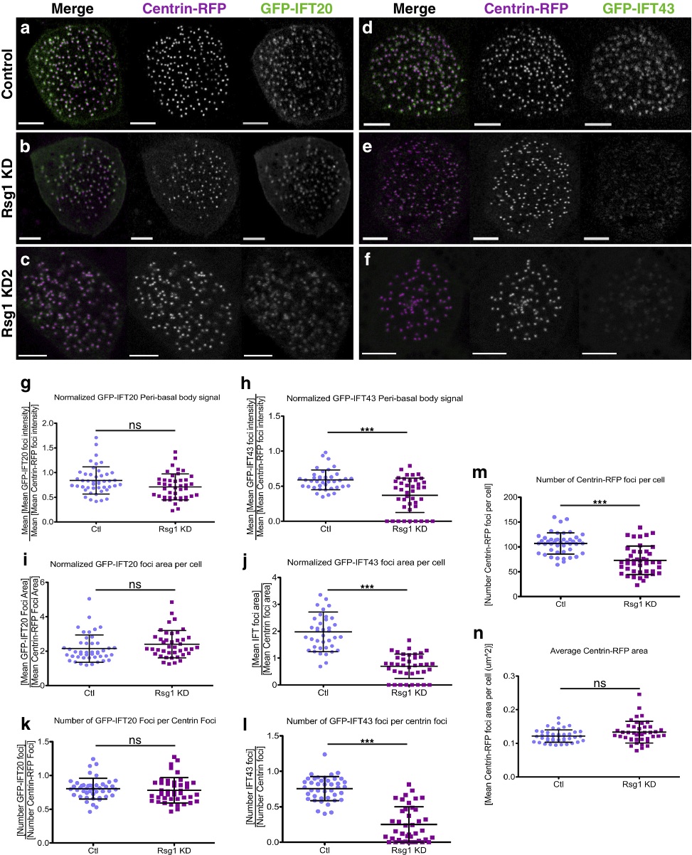 n = 47 cells, 5 embryos vs. Rsg1 KD2: 0.21 ± 0.17, n = 46 cells, 5 embryos; ***P <0.0001). (c) Quantification of the mean area of GFP-IFT20 foci in a cell normalized against the same value for centrin-RFP shows no significant change between control and Rsg1 KD2 conditions (Ctl: 2.17 ± 0.62,