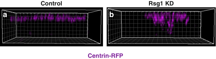 Figure 5 Rsg1 controls apical trafficking of basal bodies. (a) A 3D-reconstruction of the long axis of a control MCC shows a consistent localization of centrin-RFP foci to the apical surface. (b) A 3D-reconstruction of the long axis of an Rsg1 KD MCC shows a disorganization of centrin-RFP foci and failure of some foci to localize apically. The grid-boxes in a and b are in 1 μm increments.