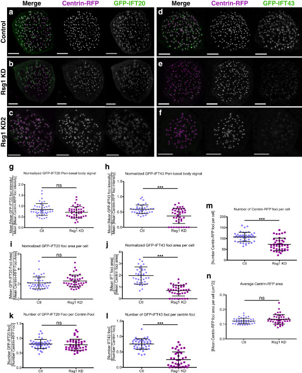 Figure 4. GFP-IFT43 but not GFP-IFT20 requires Rsg1 function for localization to peri-basal body IFT pools. (a) A single confocal slice of the apical surface of a control MCC expressing GFP-IFT20 and centrin-RFP. (b) A single confocal slice of a representative Rsg1 KD MCC co-expressing GFP-IFT20 and centrin-RFP. Note that despite the decreased density of centrin-RFP foci there is still a strong correlation between the centrin-RFP and GFP-IFT20 localization patterns. (c) A single confocal slice of a representative Rsg1 KD2 MCC co-expressing GFP-IFT20 and centrin-RFP. (d) A representative control MCC expressing GFP-IFT43 and centrin-RFP. (e) A representative Rsg1 KD MCC expressing GFP-IFT43 and centrin-RFP. Notice the impaired localization of GFP-IFT43 to centrin-RFP foci. (f) A representative Rsg1 KD2 MCC expressing GFP-IFT43 and centrin-RFP. (g) Quantification of the mean of GFP-IFT20 foci mean intensities, as normalized to the same value for centrin-RFP, shows no significant change between control and Rsg1 KD MCCs (Ctl: 0.84 ? 0.28, n = 45 cells, 8 embryos vs. Rsg1 KD: 0.71 ? 0.26, n = 43 cells, 8 embryos, P = 0.042). (h). Quantification of the mean of GFP-IFT43 foci mean intensities, as normalized to the same value for centrin-RFP, shows a significant decrease between control and Rsg1 KD MCCs (Ctl: 0.59 ? 0.14, n = 41 cells, 8 embryos vs. Rsg1 KD: 0.37 ? 0.25, n = 41 cells, 8 embryos. ***P <0.0001). (i) Quantification of the mean area of GFP-IFT20 foci in a cell normalized against the same value for centrin-RFP shows no significant change between control and Rsg1 KD conditions (Ctl: 2.14 ? 0.79, n = 44 cells, 8 embryos vs. Rsg1 KD: 2.41 ? 0.80, n = 41 cells, 8 embryos; P = 0.3477). (j) Quantification of the mean area of GFP-IFT43 foci in a cell normalized against the same value for centrin-RFP shows a significant decrease in Rsg1 KD MCCs as compared to controls (Ctl: 1.98 ? 0.74, n = 39 cells, 8 embryos vs. Rsg1 KD: 0.69 ? 0.46, n = 39 cells, 8 embryos; ***P <0.0001). (k) There is no significant change in the number of GFP-IFT20 foci detected per centrin-RFP foci between control and Rsg1 KD MCCs (Ctl: 0.81 ? 0.15, n = 45 cells, 8 embryos vs. Rsg1 KD: 0.78 ? 0.19, n = 43 cells, 8 embryos; P = 0.062). (l) There is a significant reduction in the number of GFP-IFT43 foci detected per centrin-RFP foci between control and Rsg1 KD MCCs (Ctl: 0.76 ? 0.17, n = 41 cells, 8 embryos vs. Rsg1 KD: 0.25 ? 0.25, n = 41 cells, 8 embryos; ***P <0.0001). (m) There is a reduction in the number of centrin-RFP foci detected on average in Rsg1 KD MCCs as compared to controls (Ctl: 106.90 ? 21.39, n = 45 cells, 8 embryos vs. Rsg1 KD: 72.95 ? 28.63, n = 43 cells, 8 embryos; ***P <0.0001). (n) The average area of detected centrin-RFP foci is not significantly different between control and Rsg1 KD MCCs, indicating that there are no gross abnormalities in apically docked basal bodies upon Rsg1 KD (Ctl: 0.12 ? 0.02, n = 45 cells, 8 embryos vs. Rsg1 KD: 0.13 ? 0.03, n = 42 cells, 8 embryos; P = 0.685). Scale bars in a?f represent 5 ?m.