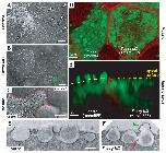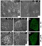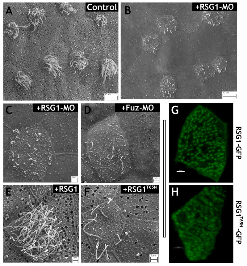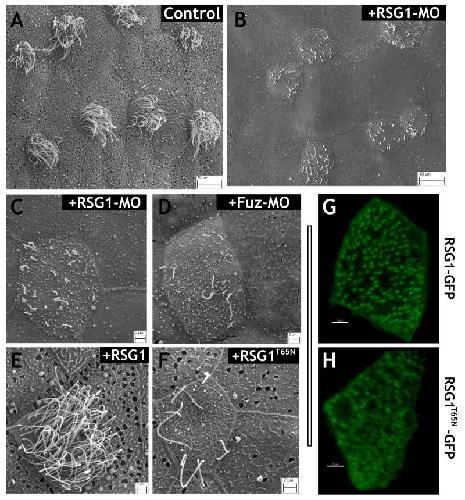 Figure 2. RSG1 controls ciliogenesis and secretion. (a) SEM of intact, control Xenopus ciliated epidermis reveals multi-ciliated cells and surrounding mucous secreting cells (b) RSG1 morphants display defects in ciliogenesis and absence of mucous granules and exocytic pits. (c) Higher-magnification view of RSG1 morphant ciliated epidermis displaying diminished cilia numbers and lengths and a decrease in exocytic pits in neighboring secretory cells. (d) Fuz morphants also display diminished cilia numbers and lengths and a decrease in exocytic pits in secretory cells. (e, f) Epidermal targeted over-expression of RSG1T65N, but not wild type RSG1, results in defects in ciliogenesis as well as decreases in mucous granules and exocytic pits in secretory cells. (g, h) GFP-RSG1 (low-level expression) localizes to the basal body region of multi-ciliated cells, whereas GFP-RSG1T65N (low-level expression) in multi-ciliated cells is diffuse and not tightly associated with basal bodies. Observations of fluorescence levels following expression of GFP-RSG1 and GFP-RSG1T65N mRNA were comparable, suggesting similar rates of translation for the two proteins.