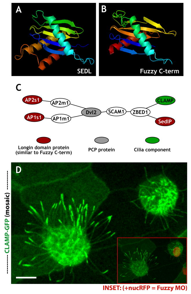 Figure 3. Homology modeling, network predictions, and experimental validation suggest a trafficking function for Fuz. (a, b) Rendered protein models (Open-Source PyMOL 0.99rc6 software). (a) Sedl N-terminal domain (pdb:1H3Q). (b) 1H3Q based homology threaded model of the C- terminal -aa(s) 287–419 - of Xenopus Fuz protein. (c) Illustration of experimentally-derived protein-protein interactions (see Supplemental Methods) linking Dvl2 with longin-domain proteins AP1s, AP2s, and SedlP as well as CLAMP. (d) Mosaic imaging of live embryo expressing CLAMP-GFP, which localizes to ciliary axonemes and apical tips. A nucRFP marks the nuclei, serving as a lineage tracer for co-injected Fuz MO. The confocal slice reveals a loss of apical localized CLAMP-GFP at ciliary tips in FUZMO cells (inset shows merge of (e) and a more basal slice to display nucRFP signal). Scale bar in (e) = 10uM.
