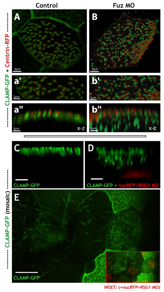 Figure 4. Fuzzy and RSG1 control trafficking to basal bodies as well as to the tips of cilia. (a, b) Fuz knockdown disrupts localization of CLAMP-GFP to the ciliary rootlet. Confocal stacks of formaldehyde fixed Xenopus epidermis expressing centrin-RFP and CLAMP-GFP mRNAs. (a) Multi-ciliated cell in x-y view from an uninjected control embryo exhibits elongated CLAMP-GFP signal extending from relatively evenly spaced basal bodies (centrin-RFP). (a′) Higher magnification view of the x-y section from [a]. (a″) X-Z projection of the stack shown in [a′] displays apical co-localization of centrin-RFP and CLAMP-GFP. (b) Ciliated cell in an x-y view of the apical surface in a Fuz morphant reveals defects in the spacing of centrin-RFP signal and defects in elongated CLAMP-GFP signal. Additionally CLAMP-GFP signal is not faithfully co-localized with centrin-RFP signal in many cases. (b′) Higher magnification view of the x-y section from [b]. (b″) X-Z-projection of the stack shown in [b′] reveals apical alignment of the centrin-RFP signal however in many cases the CLAMP-GFP signal is below the apical surface in large punctae. (c–e) Mosaic imaging of live agarose embedded embryo. CLAMP-GFP highlights a variety of epidermal structures. RFP-Histone 2B (nuc-RFP) serves as a lineage tracer for morpholino-injected cells. (c, d) 3D projections (x-z). RSG1 MO (+ nucRFP cells) display defects in normal CLAMP-GFP localization along the apical surface. (e) Confocal slice (x-y) exhibiting a loss of apical localized CLAMP-GFP to ciliary tips in RSG1 MO cells (inset shows merge of (e) and more basal slice to display nucRFP signal). Scale bars in (c, d) are 3uM; scale bar in (e) is 10μm.