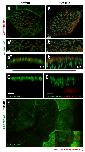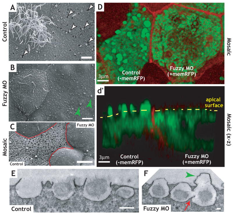 Figure 5. Knockdown of Fuz disrupts exocytosis in mucus-secreting cells. (a) Wild type multi-ciliated cell (left) flanked by secretory cells in Xenopus mucociliary epidermis. Control cells have an average of over 90 open exocytic pits per cell. (b) Fuz morphants display defects in ciliogenesis in multi-ciliated cell (left) and failure of exocytosis in mucus-secreting cells (note the absence of exocytic pits indicated by white arrowheads in [a]). Green arrowheads indicate apical membrane blebs (see also panel F, below). In a representative experiment, Fuz morphant cells had fewer than 5 exocytc pits per cell on average (difference from control is significant by the Mann-Whitney U-test; p<0.0001). Scale bars in A, B = 5μm (c) Mosaic epidermal tissue, with morphant cells outlined in red. Scale bar = 10μm (d) Confocal section (x-y) of mosaic embryo in which membrane-RFP (memRFP, red) mRNA was co-injected with Fuz morpholino and processed for Xeel (interlectin-2) antibody (green). Cell expressing a high level memRFP (right) lacks apical Xeel antibody staining comparable to the neighboring cell (right). (d′) Confocal projection (x-z) of [d] illustrates the loss of apical Xeel staining (green) in the Fuz morphant cell correlated with apical memRFP expression (right). Scale bars in D, d′ = 3μm (e) TEM of section of control Xenopus epidermis shows empty and mucus granule-containing vesicles docked at the apical surface, whereas Fuz morphants (f) display a defect of vesicle fusion with the plasma membrane release, as illustrated by large membrane protrusions (green arrows in [b, f]). Additionally, frequent homotypic vesicle fusion events were observed in secretory cells of Fuz morphants (red arrow). Scale bar in E = 500nm; Scale bar in F= 100nm.