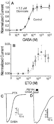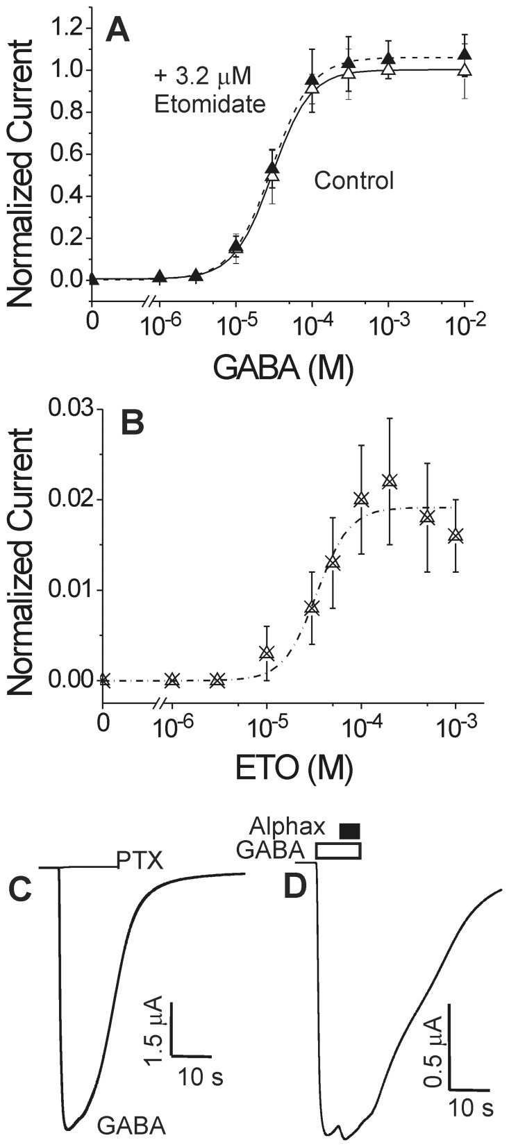 Figure 2. Electrophysiological characterization of α1β2N265Cγ2L GABAA receptors.Panel A: GABA concentration response in oocytes. Data points are mean ± sd (n ≥4) peak currents normalized to maximal GABA (1 mM) responses. Lines through data represent fits to logistic equations (Eq. 1, Methods). Open symbols: GABA alone; EC50 = 31±4.7 µM; nH = 1.75±0.088. Filled symbols: GABA plus 3.2 µM etomidate; EC50 = 30±3.2; nH = 1.67±0.068; maximum response = 1.06±0.01. Panel B: Etomidate agonism concentration response in oocytes. Data points are mean ± sd (n ≥4) peak currents normalized to maximal GABA (1 mM) responses. The line represents a logistic fit. EC50 = 35±5.7 µM; nH = 2.5±1.1; maximum response = 0.020±0.007. Panel C: Spontaneous channel gating activity in an oocyte, assessed using picrotoxin (PTX). No outward current during PTX application was observed. Current elicited with 1 mM GABA in the same cell is also displayed. Panel D: Estimation of maximal GABA efficacy in oocytes. GABA (3 mM; white bar) alone elicits a current that is enhanced about 5% with co-application of alphaxalone (2 µM; black bar). Average results for GABA efficacy are reported in Table 1.