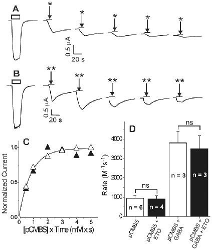 Figure 3. pCMBS modification and lack of etomidate protection in oocyte-expressed α1β2N265Cγ2L GABAA receptors.Panel A: The first trace is elicited with EC10 GABA (10 µM; white bar) and subsequent traces were recorded during sequential 10 s exposures to 0.1 mM p-chloromercuribenzenesulfonate (pCMBS; arrows; *), followed by wash. Basal currents increase with incremental exposure to pCMBS. Panel B: Traces are from another oocyte. Arrows (**) indicate 10 s exposures to 0.1 mM pCMBS plus 300 µM etomidate, followed by wash. Panel C: Rate analysis of current data from panels A (open symbols) and B (solid symbols) is shown, plotted against cumulative pCMBS exposure time. The line represents a nonlinear least squares single exponential fit to control data (no etomidate). The fitted rate constant is 1200±50 M−1s−1. The fitted rate for protection data (+ etomidate) is 1300±270 M−1s−1. Panel D: Average ± sd pCMBS modification rates in the absence and presence of 1 mM GABA and/or 300 µM etomidate.