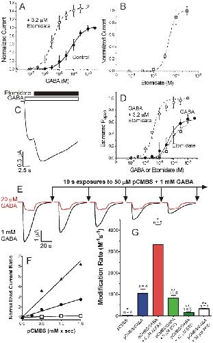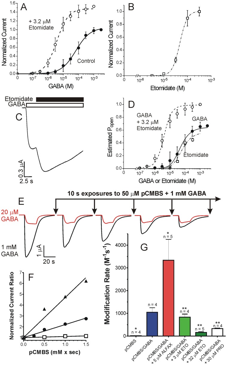 Figure 4. Modification and protection at α1M236C reflects anesthetic site occupancy.Panel A) Data represent mean ± SD peak current responses to GABA from oocytes (nâ=â4) expressing β3-α1M236C/β3-α1M236C-γ2L GABAA receptors, normalized to maximal GABA responses. Lines represent logistic fits to responses using GABA alone (solid circles; EC50â=â58 µM) and GABA with 3.2 µM etomidate (open circles; EC50â=â3.2 µM). Panel B) Data represent mean ± SD peak current responses to etomidate from oocytes (nâ=â3) expressing β3-α1M236C/β3-α1M236C-γ2L GABAA receptors, normalized to maximal GABA responses. The line represents a logistic fit with etomidate EC50â=â47 µM. Panel C) A single voltage-clamp current trace illustrating maximal GABA (3 mM; white bar above trace) efficacy in oocyte-expressed β3-α1M236C/β3-α1M236C-γ2L GABAA receptors, enhanced with addition of 10 µM etomidate (black bar). Panel D) Data from panels A and B were renormalized to maximal GABA efficacy (methods; Eq. 2) and fitted with a global MWC equilibrium co-agonist equation (methods; Eq. 3). Lines through data points represents the fitted MWC model: L0â=â10,000; KGâ=â42±8.7 µM; câ=â0.0075±0.00048; KEâ=â50±12 µM; dâ=â0.0089±0.00096. Panel E) Traces are from a single oocyte expressing β3-α1M236C/β3-α1M236C-γ2L GABAA receptors, demonstrating the effects of repeated pCMBS applications on the relative responses to low versus high GABA stimulation. Panel F) Points represent response ratios to low (EC10) vs. high GABA, normalized to pre-modification control values. Lines through data represent linear fits used to determine relative bimolecular modification rates: GABA+pCMBS (circles; 1200±57 Mâ1sâ1); GABA+pCMBS +5 µM alphaxalone (triangles; 3700±270 Mâ1sâ1); and GABA+pCMBS +32 µM etomidate (squares; 106±8.4 Mâ1sâ1). Panel G) Summary of modification rate results (mean ± se) for all oocytes expressing β3-α1M236C/β3-α1M236C-γ2L GABAA receptors under different conditions. The rate with pCMBS alone is significantly accelerated with addition of GABA and GABA/alphaxalone. Relative to GABA+alphaxalone, modification in the presence of GABA is slowed 65% by 3 µM etomidate, 95% by 32 µM etomidate, and 91% by 30 µM propofol. * p<0.05; ** p<0.01.