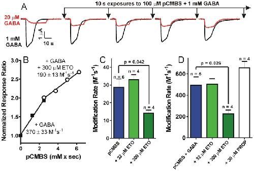 D) Summary of modification rate results for GABA-activated receptors (modified in the presence of 1 mM GABA). Modification is inhibited 54% by 300 µM etomidate. Propofol (30 µM) does not significantly inhibit modification.