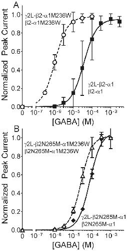 Figure 6. The βN265M mutation reduces the channel gating effects of a α1M236W mutation that mimics etomidate.Panel A) Data are reproduced from Guitchounts et al [38] showing mean ± SD GABA concentration-response, normalized to maximal currents, from oocytes expressing concatenated receptor dimer and trimer constructs. Lines through data points represent non-linear least squares logistic fits (Eq. 1, methods). Solid squares represent β2-α1/γ2L-β2-α1 receptors (GABA EC50 = 36 µM) and open circles represent β2-α1M236W/γ2L-β2-α1M236W receptors (EC50 = 1.0 µM). Panel