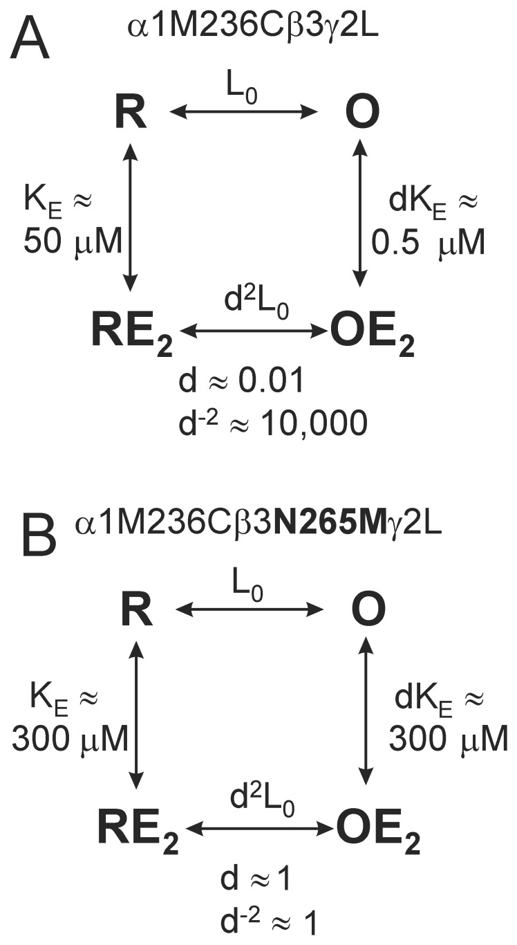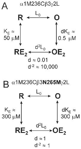 Figure 7. Effects of βN265M mutation on etomidate in inactive versus active GABAA receptors.Monod-Wyman-Changeux equilibrium allosteric models are diagrammed for both α1M236Cβ2γ2L (A) and α1M236Cβ2N265Mγ2L (B) receptors, each with two equivalent etomidate sites. Etomidate dissociation constants for both inactive (R; KE) and GABA-activated (O; dKE) receptors are rounded estimates based on both functional analysis and modification/protection results (Figs. 6 and 7). Etomidate-sensitive α1M236Cβ2γ2L receptors bind etomidate 100-fold more avidly in the active vs. inactive state, resulting in a 10,000-fold shift in the open-closed equilibrium constant (d2L0 vs. L0) when both sites are occupied. In contrast, etomidate-insensitive α1M236Cβ2N265Mγ2L receptors display low affinity (KE ≈ dKE ≈ 300 µM) for etomidate in both resting and GABA-activated states. Thus, high etomidate concentrations result in only partial site occupancy and weak modulatory effects.