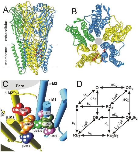 [20]. Both the extracellular domains and transmembrane domains are shown in relation to membrane lipids. Subunits are color-coded (α1â=âblue; β3â=âyellow; γ2Lâ=âgreen). βN265 and other residues involved in etomidate and propofol binding are depicted as red stick structures in one of two β+/αâ transmembrane interfacial sites. Panel B: A view of the transmembrane domains from the extracellular space shows the structure of each subunitâs four-helix bundle and the arrangement of subunits around the central chloride channel (grey circle). Residues in one interfacial anesthetic site are depicted as red stick structures. Panel C: A close-up view of one β+/αâ transmembrane inter-subunit etomidate binding site in the homology model. Helix backbones are depicted as solid cylinders. The βN265 residue and six anesthetic contact residues identified by photolabeling or cysteine modification/protection are highlighted as labeled space-filling structures. Panel D: A Monod-Wyman-Changeux two-state (inactiveâ=âR; activeâ=âO) equilibrium co-agonist scheme with two equivalent orthosteric agonist (GABA; G) sites and two equivalent allosteric agonist (etomidate; E) sites is depicted [1]. For simplicity, states with only one occupied agonist site are omitted. The model is defined by five equilibrium parameters (see Eq. 3, methods): L0 is a basal gating equilibrium (C/O); KG and KE are dissociation constants for respectively, GABA and etomidate binding to inactive receptors; c and d quantify the binding affinity ratios for respectively, GABA and etomidate to active vs. inactive receptors. Maximal agonist efficacies for GABA and etomidate are respectively, (1+L0c2)â1 and (1+L0d2)â1.