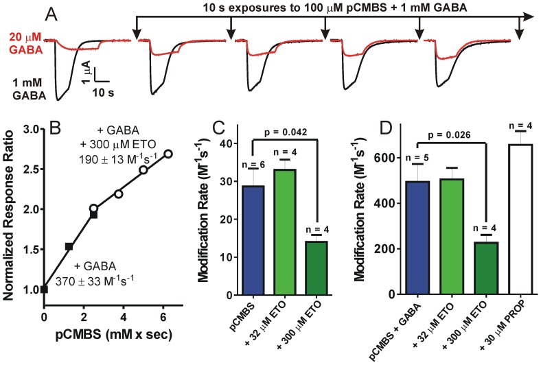 B) Points represent response ratios to low (EC10) vs. high GABA, normalized to pre-modification control values, for one oocytes exposed to: GABA+pCMBS (solid squares) followed by GABA+pCMBS +300 µM etomidate (open circles). Lines through data represent linear fits; labels are the apparent bimolecular modification rates (slopes). Panel