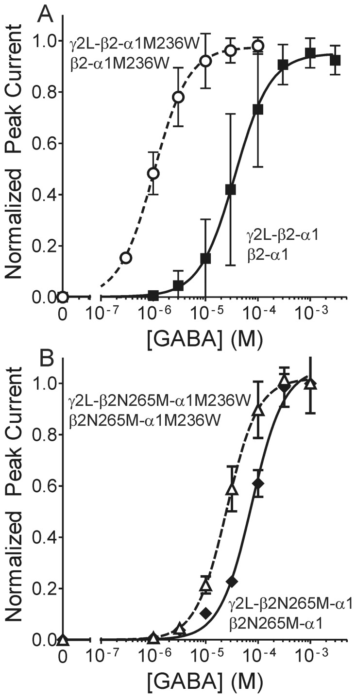 B) Data points are mean ± SD current responses to GABA, normalized to maximal currents. Solid diamonds represent β2N265M-α1/γ2L-β2N265M-α1 receptors (GABA EC50 = 76 µM; 95% CI = 63 to 92 µM) and open triangles represent β2N265M-α1M236W/γ2L-β2N265M-α1M236W- receptors (EC50 = 25 µM; 95% CI = 22 to 29 µM).