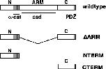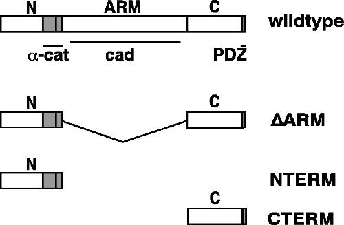 Schematic diagram of mutant β-catenin constructs. Wild-type β-catenin consists of three distinct functional and structural domains: an N-terminal domain, a central core consisting of 12 armadillo repeats, and a C-terminal domain. Within these three domains, β-catenin contains binding sites for α-catenin (N-terminal domain and armadillo repeats R1-R2; amino acid residues 120-150), cadherins (binding spans throughout armadillo repeats R3-R12), and PDZ-domain-containing proteins (C-terminal domain; amino acid residues 777-781). The deletion mutant ÎARM lacks almost the entire armadillo repeat region found in wild-type β-catenin; it consists of the N-terminal residues 1-151 of wild-type β-catenin fused to the C-terminal residues 648-781. Thus, ÎARM retains binding to α-catenin and PDZ-binding proteins but not to cadherin. The deletion mutants NTERM and CTERM are simply the N- and C-terminal domains of β-catenin that together constitute ÎARM. Each protein had GFP fused to its N terminus and was expressed using the Xenopus expression vector pCS2. ÎARM and CTERM also contained a myc-epitope tag at their C termini. We also confirmed the effects of ÎARM without an attached GFP tag and of CTERM without attached GFP or myc tags (see Results).