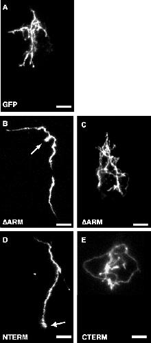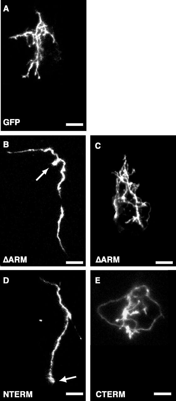 Axonal arborization phenotypes of RGCs expressing β-catenin deletion mutants. Projected confocal z-series images taken of axon arbors in live tadpoles show arbor morphologies for RGCs expressing GFP (A) or GFP-tagged-β-catenin deletion mutants (B-E). RGC axons that express the β-catenin deletion mutant ÎARM have two distinct phenotypes. They either do not arborize (B) or they arborize but contain longer, tangled branches (C). RGC axons expressing the β-catenin deletion mutant NTERM form severely reduced arbors (D) that are similar to the subpopulation of ÎARM arbors with no or few branches (B). RGC axons expressing CTERM form arbors with long, tangled branches (E) that are similar to the subpopulation of ÎARM arbors with effusive branching (C). RGC axons that express ÎARM and NTERM and form severely reduced arbors (B, D) also have bulbous endings at their axon/branch tips (B, D, arrows) and appear thicker than RGC arbors that express GFP, ÎARM, and CTERM (compare axon/branch thicknesses in B, D with those in A, C, E). Note that at the level of magnification of these projected confocal z-series (40Ã), all of the GFP-tagged-β-catenin deletion mutant constructs appear to be uniformly distributed within the axon terminals and arbors. Scale bars: A-E, 20 μm.
