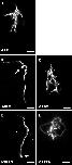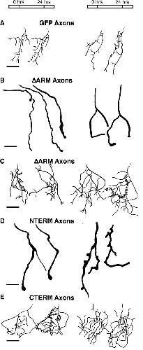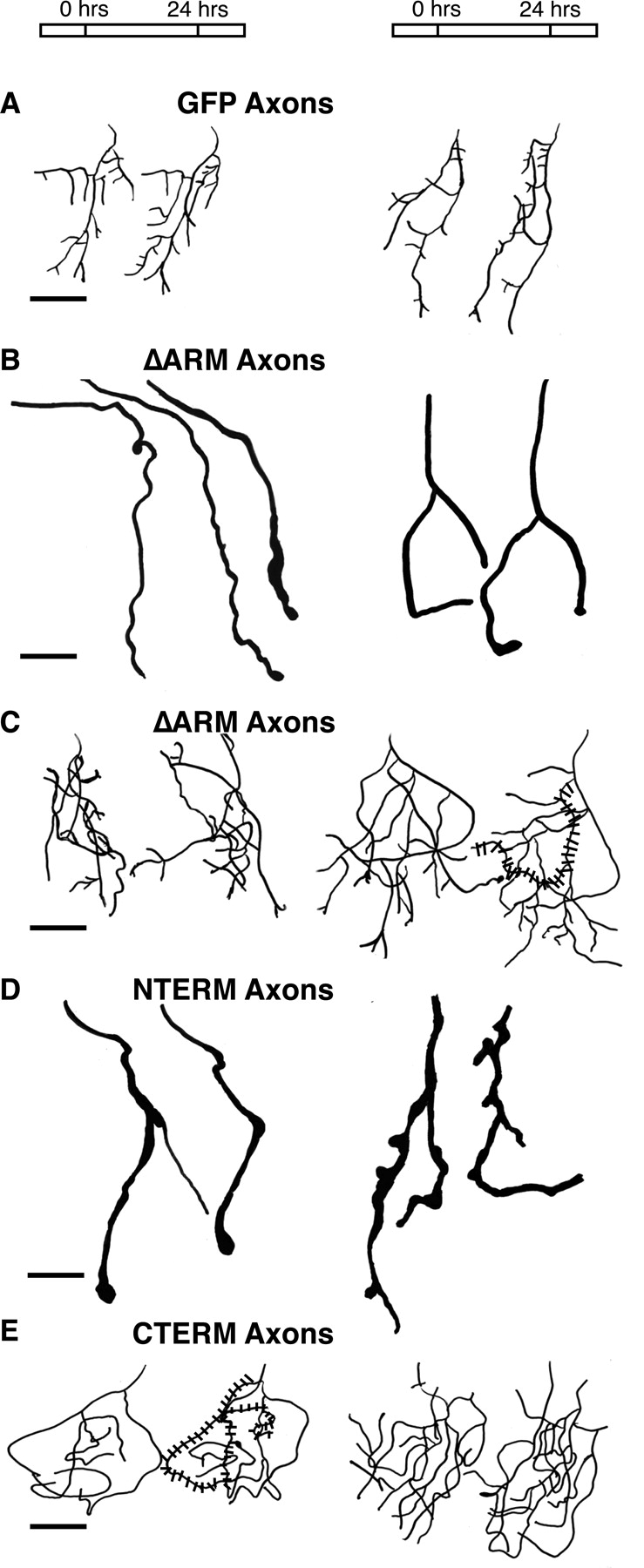 Tracings of projected confocal z-series of RGC axon arbors expressing β-catenin deletion mutants confirm morphological phenotypes. Compared with controls, RGC axons that express ÎARM have two distinct phenotypes. They either do not arborize (B) or they arborize but have abnormally long and tangled branches (C). NTERM-expressing arbors (D) are similar to the subpopulation of ÎARM arbors with no or few branches (B). CTERM-expressing arbors (E) are similar to the subpopulation of ÎARM arbors with abnormally long, tangled branches (C). For each condition (A-E), two examples of arbors are shown. In each example of an arbor, two (or three) (B, left) tracings are shown that correspond to confocal images taken â¼ 24 hr apart. The first tracing of each example corresponds to a confocal image taken at stage 45/46. The left most arbor tracing in A-E corresponds, respectively, to the actual confocal z-series projection image shown in Figure 3A-E. Stippling over a single arbor branch in C and E illustrates a particularly tangled branch. Rostral is to the top and lateral is to the right in all images. Scale bars, 20 μm (A-E).