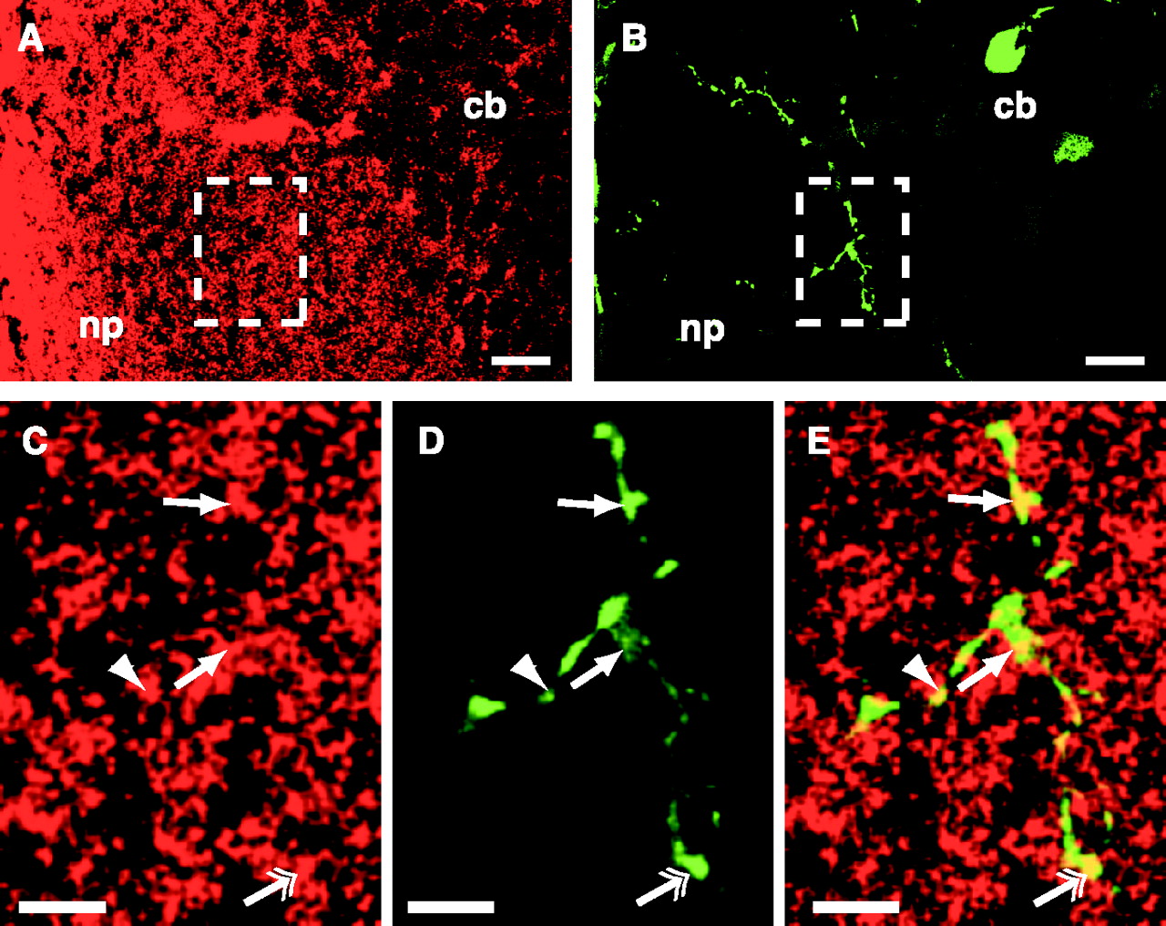 β-catenin is expressed in RGCaxon arbors in the tectum. Confocal image (single optic section) of a tectal section taken from a stage 45/46 tadpole stained with anti β-catenin antibody (red) shows expression in the neuropil area, the target region for RGC axons (A). Confocal image of a GFP-expressing RGCaxon arbor (green) in the same optic section shows that the axon arbor is in the neuropil region of the tectal section (B). Higher magnification zoom of boxed regions in A and B shows that β-catenin staining is punctate in the neuropil (C) and that the GFP-expressing RGCaxon arbor contains β-catenin puncta (E, arrows, double arrow, arrowhead). β-catenin puncta are located at branch points (D, arrows), in growth cones (D, double arrow), and along branch shafts (D, arrowhead). np, Neuropil region of the tectum; cb, cell body region of the tectum. Scale bars: A, B,10 μm; C-E, 5 μm.