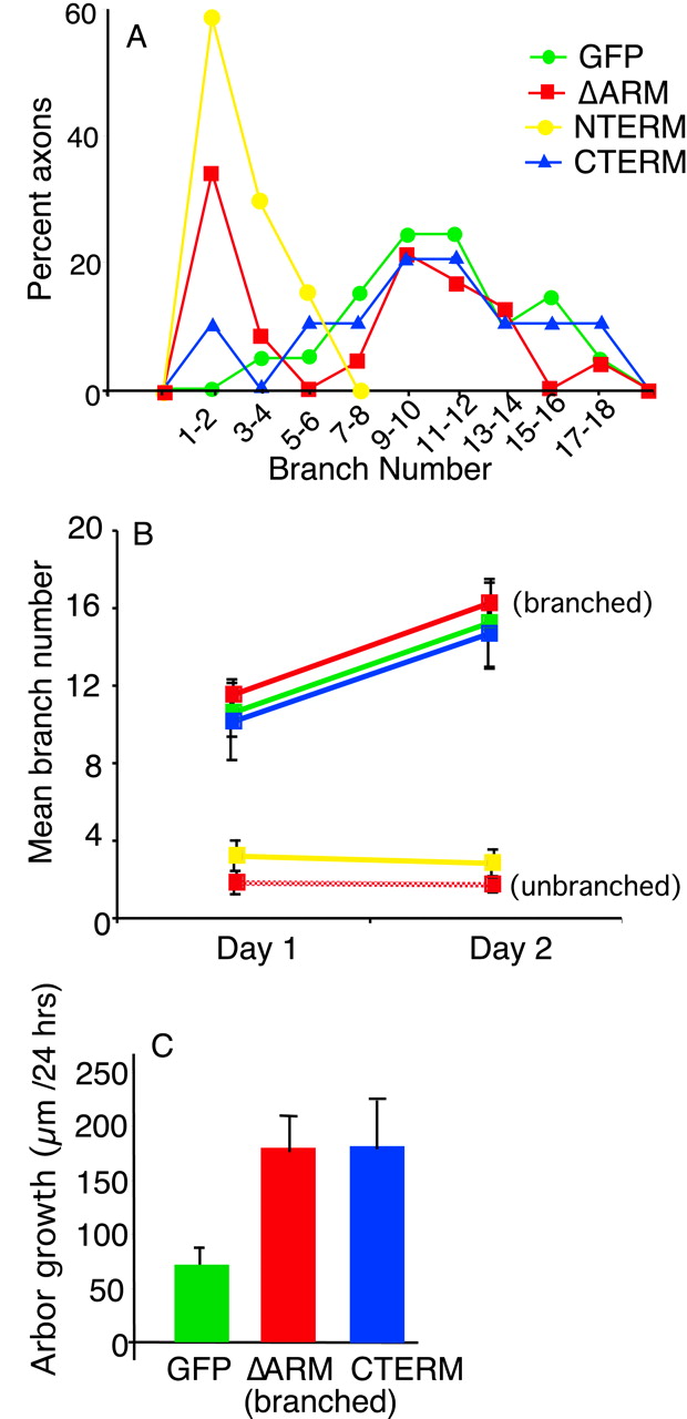 Quantification of morphological parameters for arbors from RGCs expressing β-catenin deletion mutants confirm phenotypes shown in Figures 3 and 4. The distribution of branch numbers in arbors at stage 45 shows that GFP axon arbors are distributed about a mean of â¼11 branches (A). In contrast, ÎARM axons are distributed about two distinct means: ÎARM arbors either have very few (1-2) branches or they have approximately the same number of branches as control GFP arbors (A). In addition, NTERM arbors have no or very few (1-6) branches, whereas CTERM arbors have numbers of branches comparable with GFP arbors (A). Plot of mean numbers of branches in arbors over 2 d shows that GFP arbors acquire more branches over time (B). ÎARM arbors with branches and CTERM arbors behave similarly to GFP arbors (B). In contrast, ÎARM axons without arbors and NTERM axons form few or no additional branches over time (B). Branched ÎARM arbors (with 9 or more branches) and CTERM arbors also grow faster than GFP arbors (C) (p < 0.05 for both, Student's t test). We did not measure the growth rate for unbranched ÎARM and NTERM arbors because many RGCs in these two classes did not form arbors (C). The number of axons analyzed is as follows: A, GFP (21), ÎARM (24), NTERM (7), CTERM (10); B, GFP (10), ÎARM-branched (6), ÎARM-unbranched (6), NTERM (7), CTERM (10), (C) GFP (9), ÎARM-branched (6), CTERM (10).