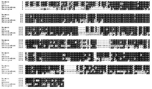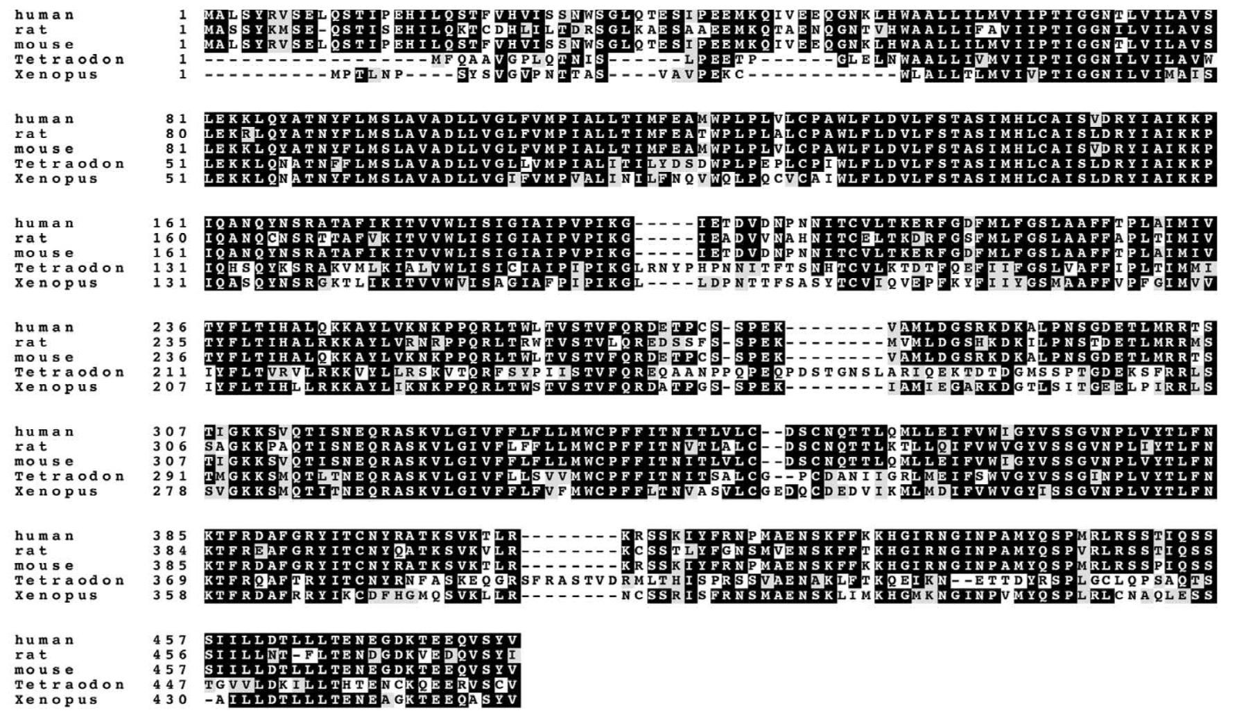 Fig. 1. ClustalW alignment of the amino acid sequence of X. laevis 5-HT2B receptor with known homologues (human: Swiss-Prot accession no. P41595; rat (Rattus norvegicus): P30994; mouse (Mus musculus): Q02152; Tetraodon fluviatilis: Q8UUG8). Black boxes indicate amino acid identity, grey boxes amino acid similarity. Note the conserved S/TXV motif at the carboxy-terminus (isoleucine substitutes valine in the rat sequence). The box shading alignment was generated on the BOXSHADE server at www.ch.embnet.org.