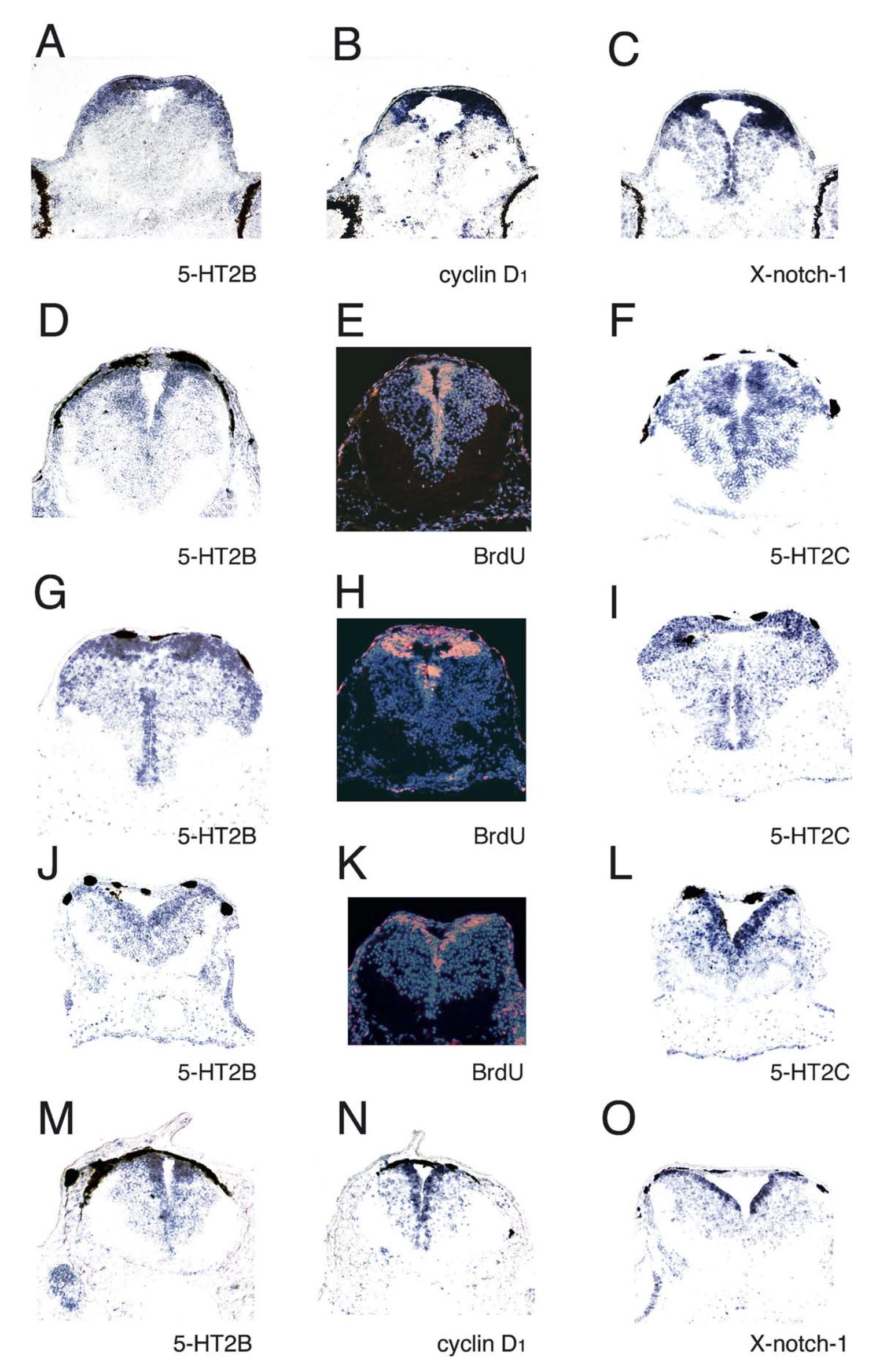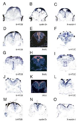 Fig. 3. Expression pattern of 5-HT2B and 2C receptor mRNAs in the larval brain. The probes used are indicated at bottom of each panel. The figure shows transversal sections of larvae neural tube at stage 40 (AâC) and 45 (DâO). Panels correspond to diencephalon (DâF), mesencephalon (AâC, GâI); anterior (JâL and O) and posterior rhomboencephalon (MâN). Proliferating zones are evidenced by BrdU incorporation (E,H,K) and by labelling with proliferation markers (B,C,N,O). (E,H,K): in blue, Hoechst nuclear staining; BrdU incorporation is viewed as orange fluorescence.