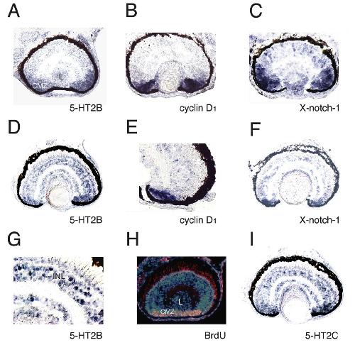 Fig. 4. Expression of 5-HT2B and 2C receptor mRNAs in developing retina. Transverse sections through the eye of a stage 40 (AâC) and 45 larva (DâI). The probes used are indicated at bottom of each panel. The CMZ is labelled by proliferation markers (B,C,E,F) and stained with anti-BrdU antibody after BrdU incorporation (H). In blue, Hoechst nuclear staining; orange, BrdU incorporation. (G) is an enlargement of (D) to show the scattered postmitotic cells expressing 5-HT2B transcripts in the INL. CMZ, ciliary marginal zone; L, lens; INL, inner nuclear layer.
