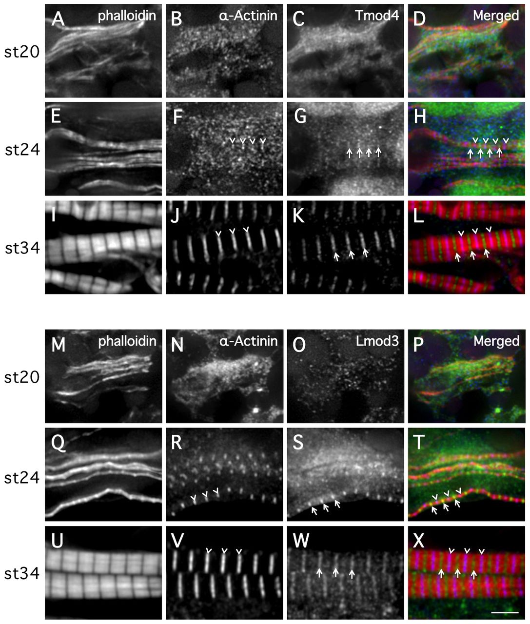 localization of a-actinin (B) or Tmod4 staining (C). (EâH) At st24,