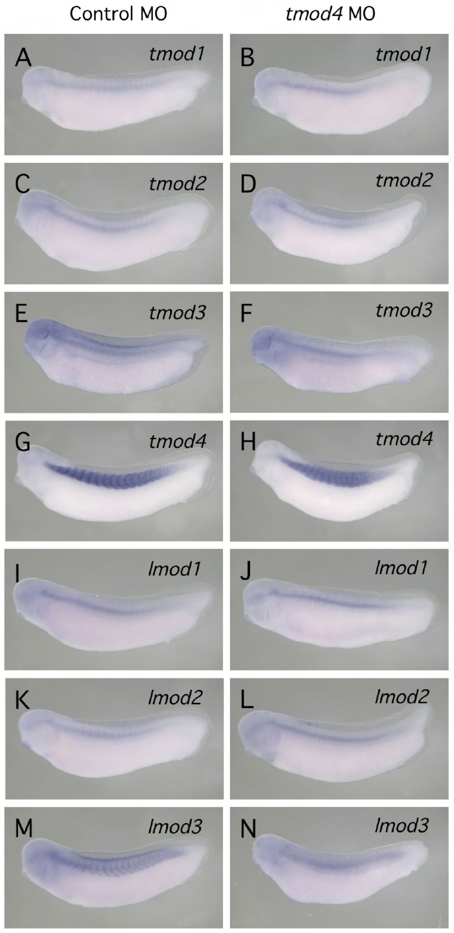 altered by tmod4 MO treatment. tmod (A-H) and lmod (I-N) family gene expression