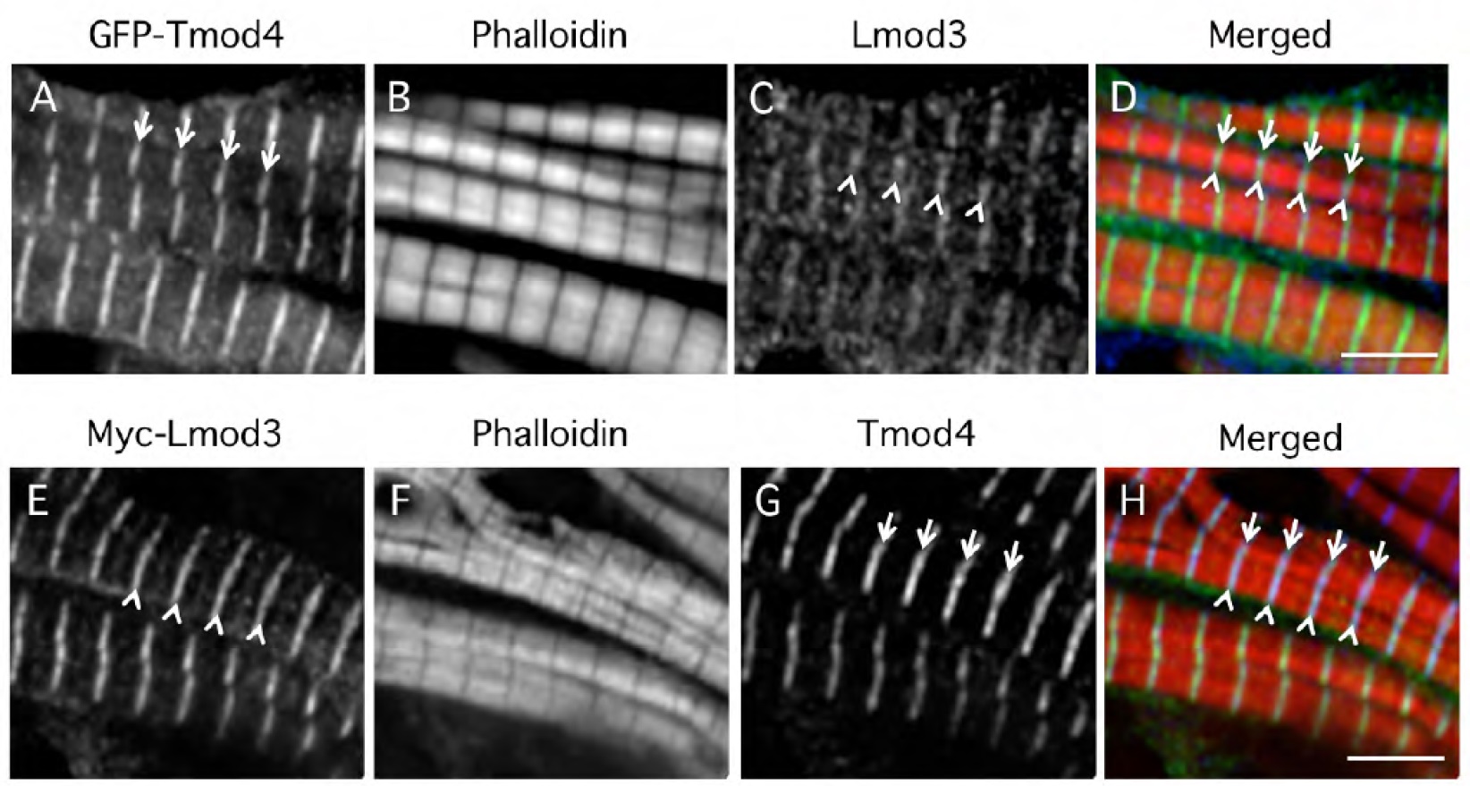 arrowheads indicate Lmod3 localization, co-localizing with Tmod4 at the M-line. Scale