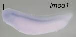 lmod1 (leiomodin 1 (smooth muscle)) gene expression in Xenopus laevis embryo, assayed via in situ hybridization, NF stage 15, lateral view, anterior left, dorsal up.