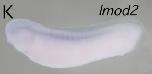 lmod2 (leiomodin 2 (cardiac)) gene expression in Xenopus laevis embryo, assayed via in situ hybridization, NF stage 34, lateral view, anterior left, dorsal up.