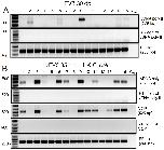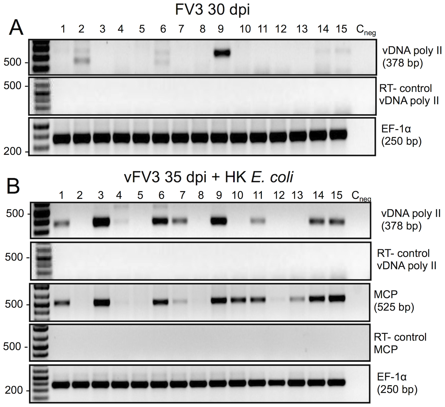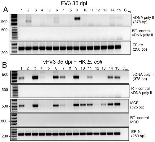 RT-PCR assay of DNase-treated RNA purified from PLs harvested from the same 15 different frogs used in Fig. 2 ((Experiment 3 in Table 2) at 30 dpi (A), and 3 days later after bacterial stimulation at 35 dpi (B) using FV3 specific primers for vDNA pol and MCP as well as X. laevis Ef-1α as a loading control. RT minus controls were included to rule out contamination by genomic DNA.