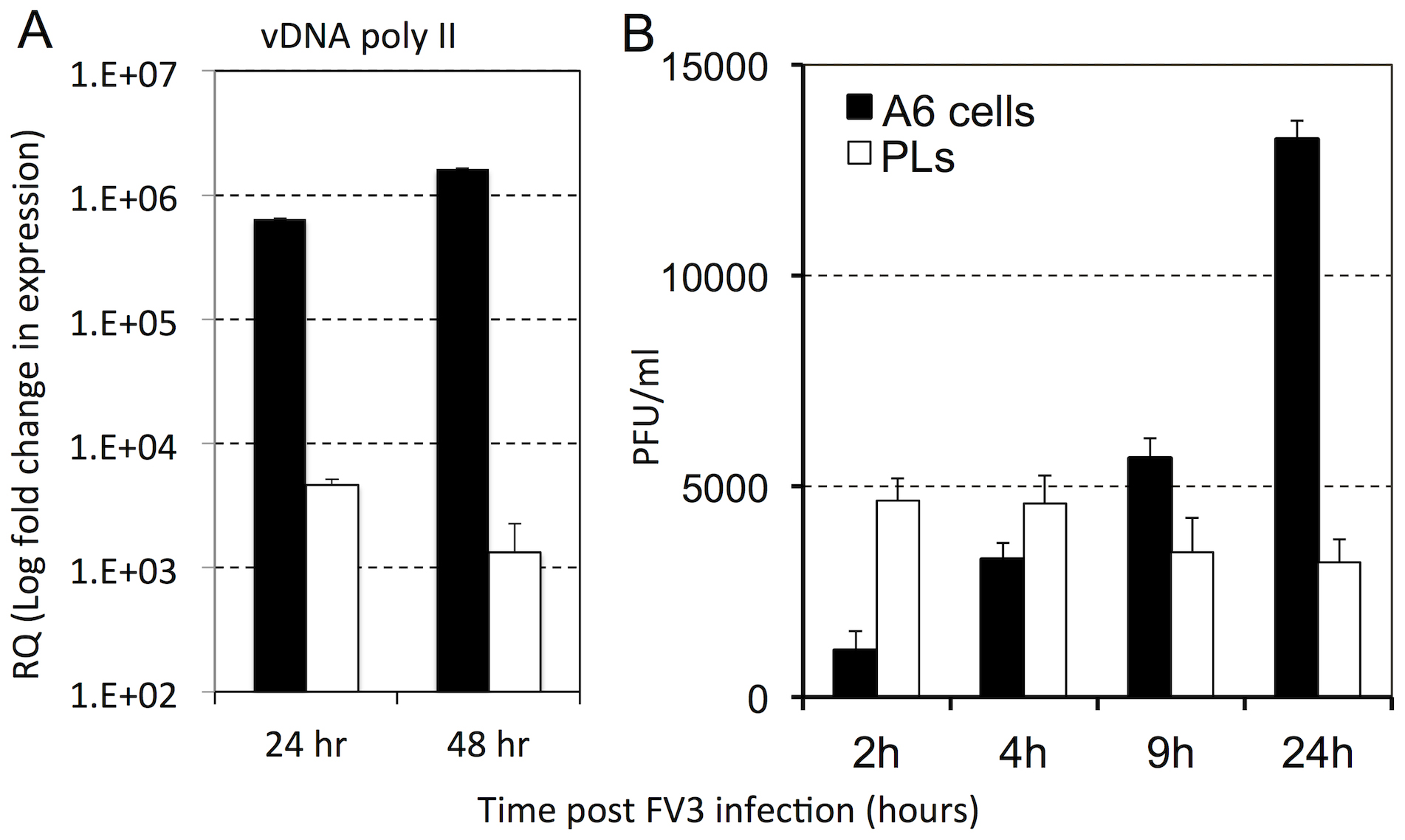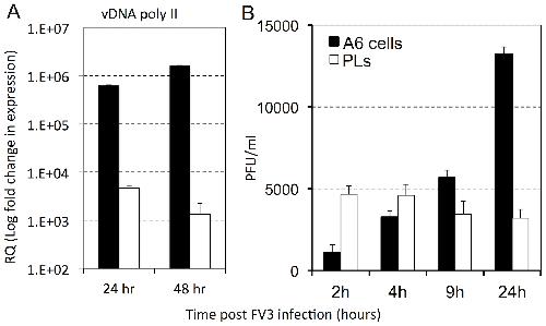 PLs from uninfected outbred animals and Xenopus A6 kidney cells were seeded at 1×106 cells/well and infected with a MOI of 1 for (A) 24 and 48 hrs or (B) 2, 4, 9, 24 hrs. (A) The PLs and A6 cultures infected for 24 and 48 hrs were assessed for FV3 vDNA Pol II gene expression by the delta∧deltaCT method qRT-PCR, using GAPDH as an endogenous control. (B) The FV3 infectious burdens were enumerated by performing plaque assays on FV3-infected PLs and A6 culture lysates. Results are means ± SEM, N = 3.
