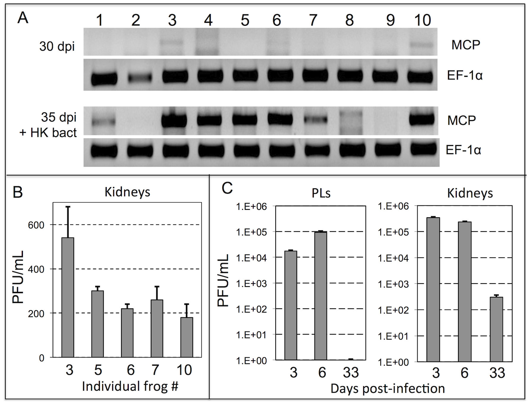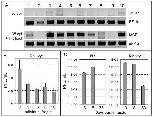 (A) PCR assay on total DNA purified from PLs harvested from 10 different outbred frogs at 30 dpi and 35 dpi, (3 days after bacterial stimulation). Presence of viral DNA was assed by PCR on 50 ng of total DNA using FV3 specific primers for MCP as well as X. laevis Ef-1α as a loading control. (B) Number of infectious FV3 (PFU/ml/whole kidney) detected in kidney by plaque assay for frogs number (#) 3, 5, 6, 7, 10 from A sacrificed at 35 dpi. (C) Number of infectious FV3 detected by plaque assay from PLs and kidneys of FV3 infected frogs at 3, 6 and 33 dpi (3 individual for each time point).