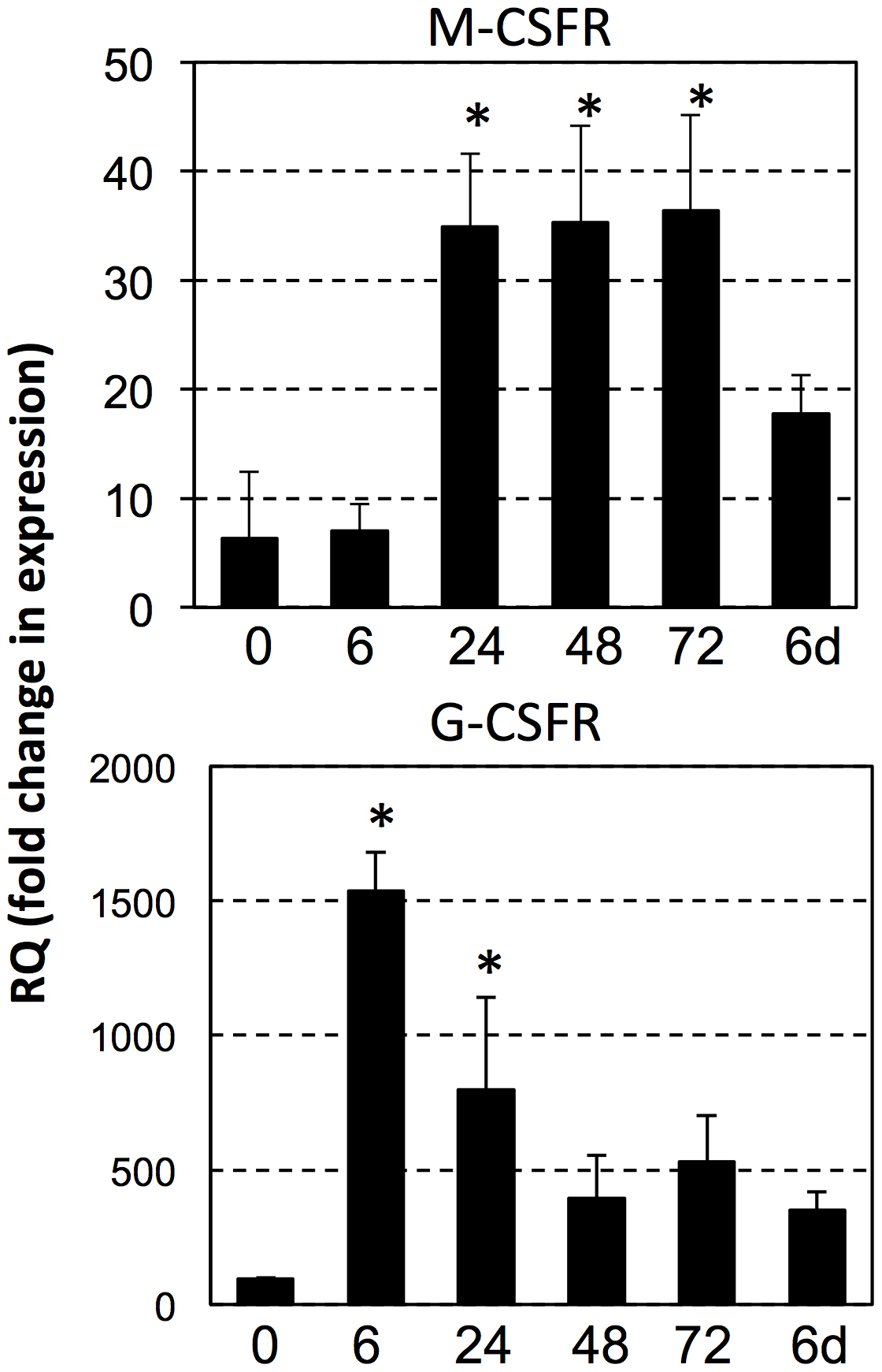 At different time points (6, 24, 48, 72 hrs and 6 days) following injection of heat killed E. coli, peritoneal phagocytes were isolated and assessed by qRT-PCR for genes expression of M-CFSR and G-CSFR. Gene expression was normalized relative to the GAPDH control. Results are means ± SEM; (*) over bars indicates significant differences between untreated control and experimental animals (3 individual per group).