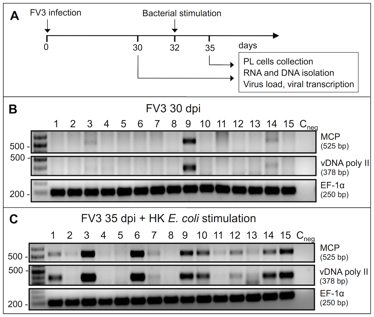 (A) Experimental outline. (B) PCR assay on total DNA purified from PLs harvested from 15 different outbred frogs (Experiment 3 in Table 2) at 30 dpi, and (C) PCR assay on DNA purified from PLs collected from the same animals 3 days after bacterial stimulation (35 dpi). Presence of viral DNA was assed by PCR on 50 ng of total DNA using FV3 specific primers for MCP and vDNA poly II as well as X. laevis Ef-1α as a loading control.