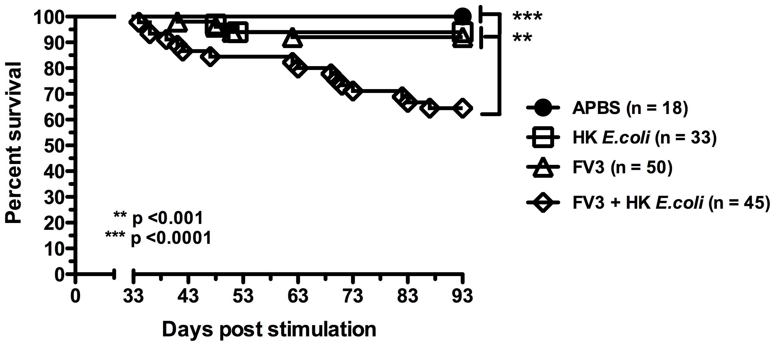 Kaplan-Meier curves represent outbred individual animals from three different experiments (35 total animals) that were infected with 1×106 PFU of FV3, subjected to a peritoneal lavage at 30 dpi, injected with heat-killed bacteria and subjected to another peritoneal lavage at 35 dpi, then monitored daily for signs of FV3 infection and death for 60 days (FV3+HK E. coli). Control animals included a group of 18 uninfected animals injected with saline vehicle (APBS), a group of 33 animals shame-infected with APBS that underwent peritoneal lavages and bacterial stimulation (HK E. coli), and a group of 40 animals infected with 1×106 FV3 (FV3). Statistical analysis was performed using the log-rank test (Mantel Cox) of a GraphPad Prism version 6.00 for Windows, La Jolla California USA, (URL: www.graphpad.com). The result are as follows: APBS vs HK E. coli, P<0.1; APBS vs FV3, P<0.1; APBS vs FV3+HK E coli, P<0.001; HK E. coli P vs FV3+HK E. coli, P<0.001.