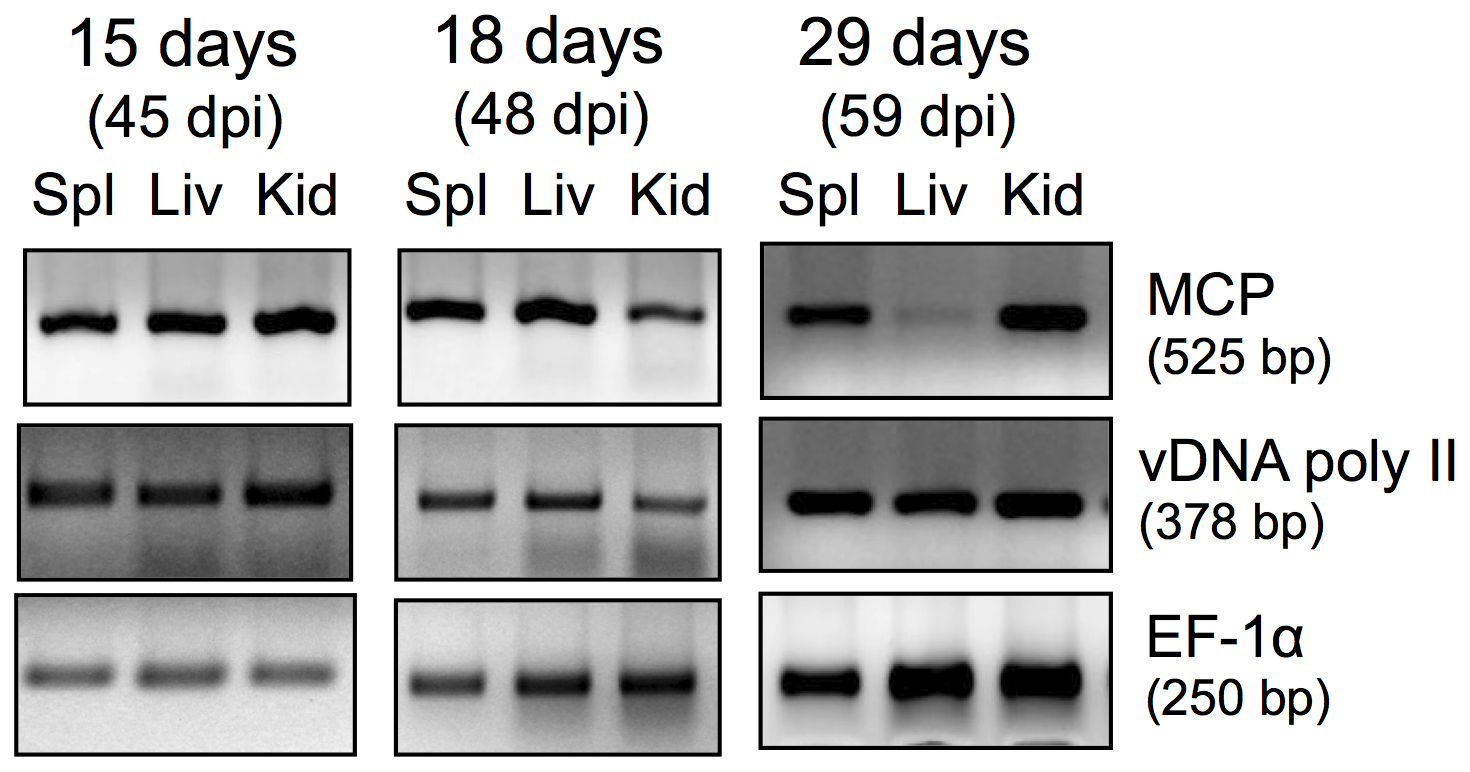 PCR was performed on DNA extracted from spleen (Spl), liver (Liv) and kidneys (Kid) of a representative of frogs that died 15, 18 or 29 days after bacterial stimulation (45, 48 or 59 dpi, respectively) using primers specific for FV3 MCP, vDNA poly II and EF-1α as control.